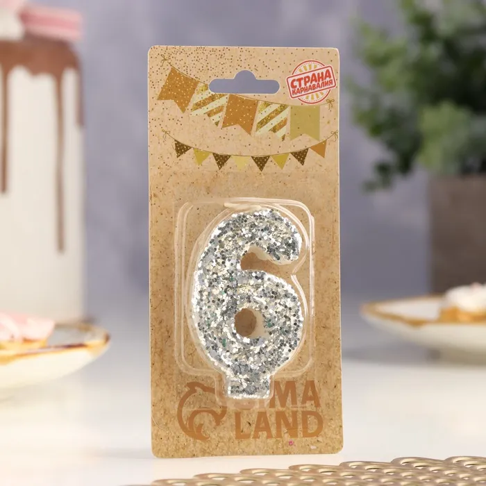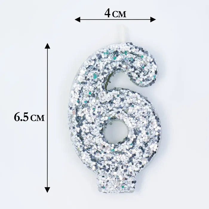 Свеча в торт с блестками «Цифра 6», 6.5×4 см, серебряная — Характеристики