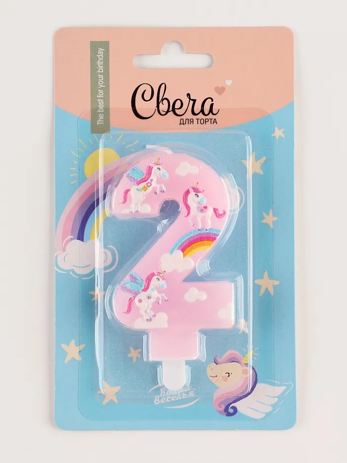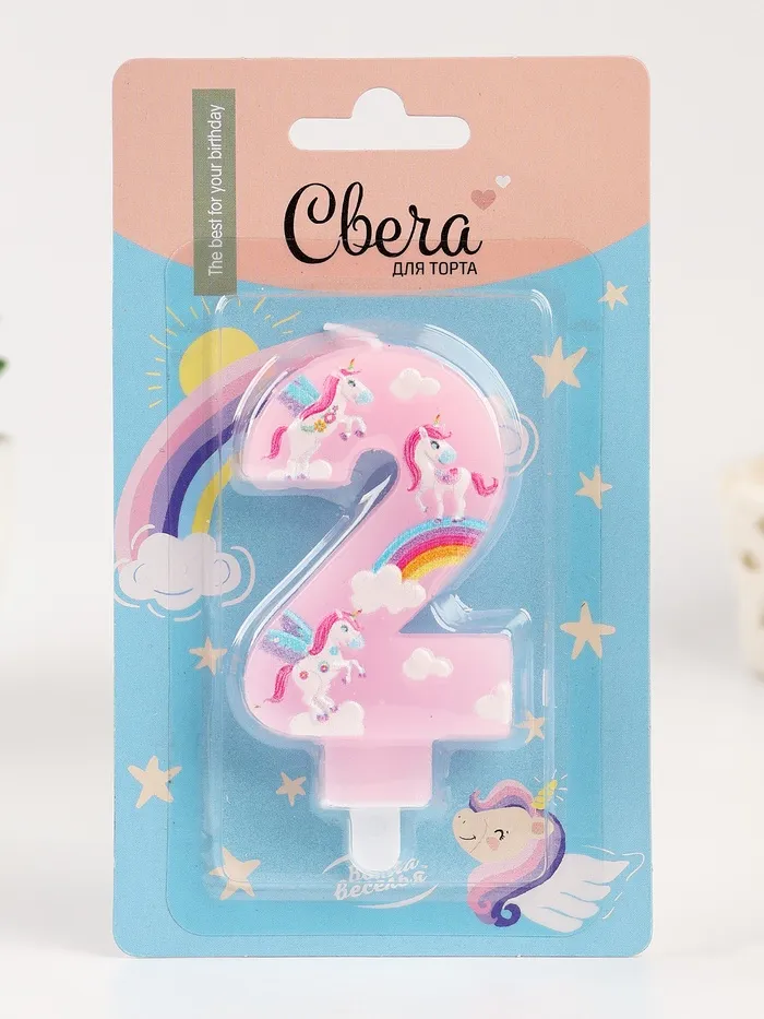 Свеча в торт «Волшебные единороги», цифра 2, розовый, 9 см — Характеристики