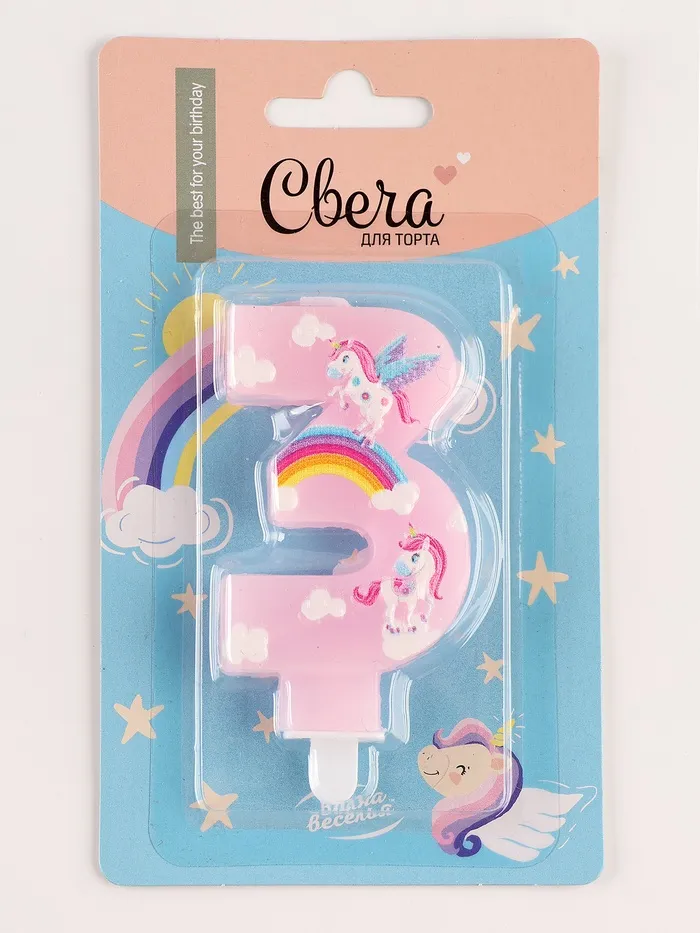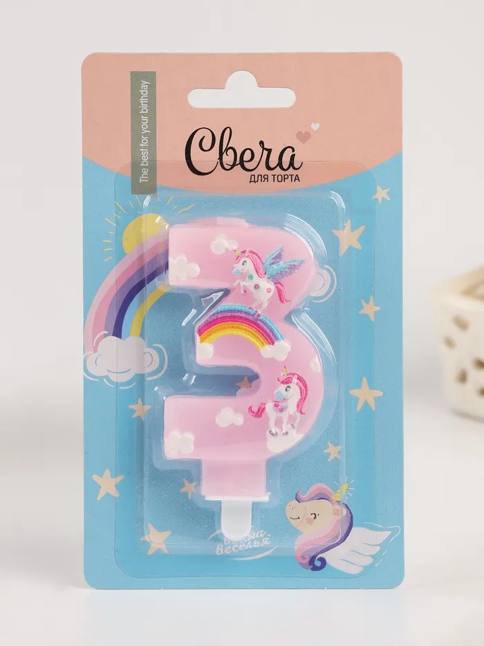 Свеча в торт «Волшебные единороги», цифра 3, розовый, 9 см — Характеристики