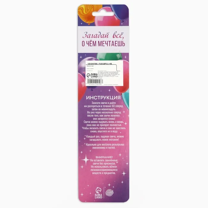 Свечи для торта - это неотъемлемый атрибут праздника. Набор свечей станет прекрасным украшением торта и других кондитерских изделий по случаю дня рождения, юбилея и любого другого торжества. Украсьте угощение стильными свечами, чтобы сделать особенный день ещё более ярким и незабываемым. Для того, чтобы свечи не задувались, им нужно дать 60 секунд разгореться, после чего их можно будет задувать, но уже через несколько секунд, как они погаснут, свечи загорятся снова. Для того,чтобы свечи все-таки потушить, их рекомендуется примочить водой или придавить фитиль свечи. Изготовлены из высокоочищенного пищевого парафина, который не влияет на вкусовые качества блюд, а удобная упаковка помогает сохранять свечи при длительном хранении и транспортировке.