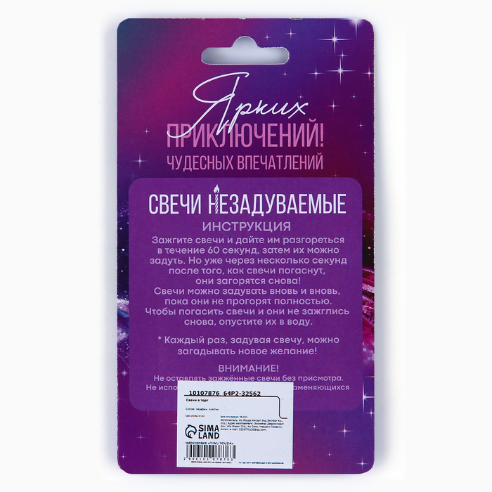 Свечи для торта - это неотъемлемый атрибут праздника. Набор свечей станет прекрасным украшением торта и других кондитерских изделий по случаю дня рождения, юбилея и любого другого торжества. Украсьте угощение стильными свечами, чтобы сделать особенный день ещё более ярким и незабываемым. Для того, чтобы свечи не задувались, им нужно дать 60 секунд разгореться, после чего их можно будет задувать, но уже через несколько секунд, как они погаснут, свечи загорятся снова. Для того,чтобы свечи все-таки потушить, их рекомендуется примочить водой или придавить фитиль свечи. Изготовлены из высокоочищенного пищевого парафина, который не влияет на вкусовые качества блюд, а удобная упаковка помогает сохранять свечи при длительном хранении и транспортировке.