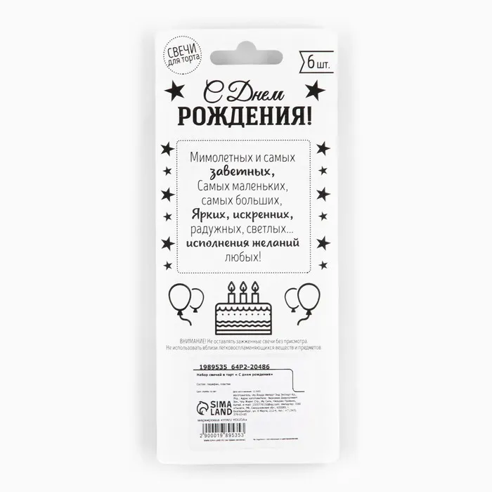 Свечи для торта на День рождения - неотъемлемая часть праздника. Украсьте угощение свечами, чтобы сделать особенный день в году ещё более ярким и незабываемым. Ведь задувание свечей вызывает бурные эмоции и у взрослых, и у детей, потому что в любом возрасте мы все мечтаем об исполнении желаний и для всех нас это один из самых трогательных и волшебных моментов. Яркие свечи украсят праздничный стол и создадут нужную атмосферу. Изготовлены из высокоочищенного пищевого парафина, который не влияет на вкусовые качества блюд, а удобная упаковка помогает сохранять свечи при длительном хранении и транспортировке.