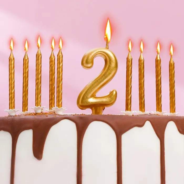 Свечи для торта «С Днём Рождения»: цифра 2 + классические, золотые 10 шт., 7 см — Характеристики