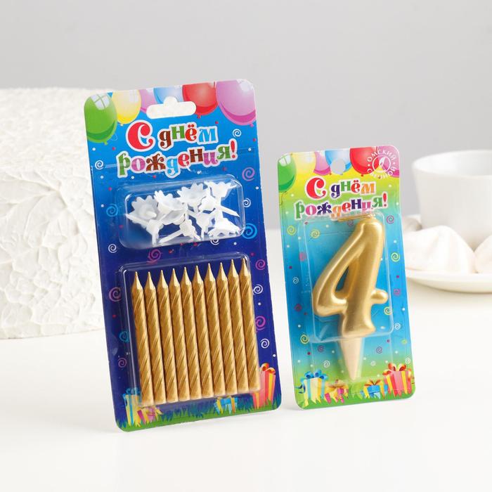 Свечи для торта «С Днём Рождения»: цифра 4 + классические, золотые 10 шт., 7 см