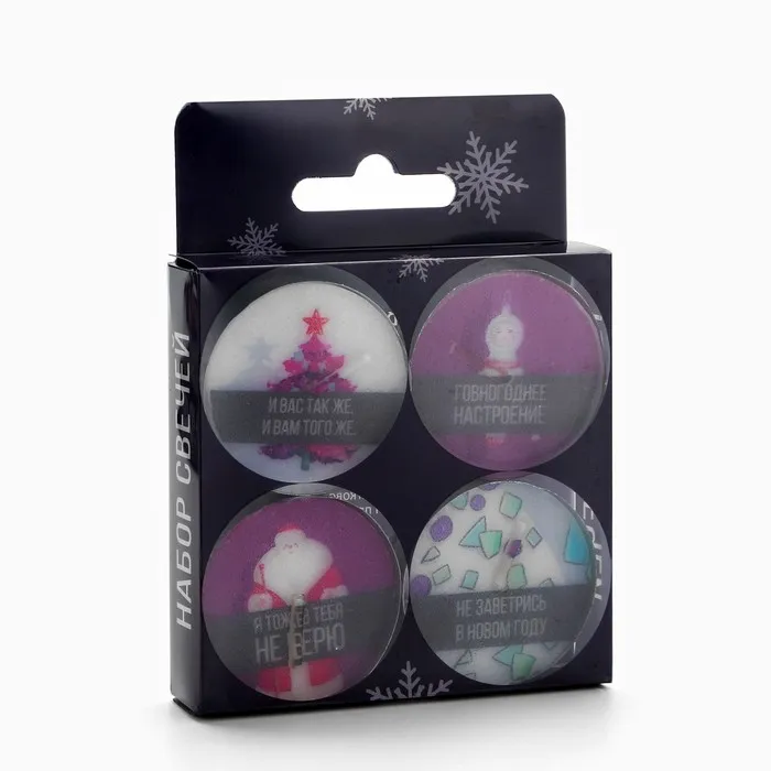 Подарочный набор чайных свечей с приколом, без аромата, не только наполнит ваш дом радостной атмосферой предвкушения праздника, но и дополнит предпраздничный интерьер вместе с елкой и гирляндами. Свечи выполнены в жестяных гильзах (3,7 х 3,7 х 1 см.), которые дополнены эксклюзивной печатью на самом изделии. Также свечи упакованы в подарочную коробку (7,7 х 1,7 х 10,5 см), что позволит использовать их в качестве подарка маме, сестре, бабушке, подруге, девушке!