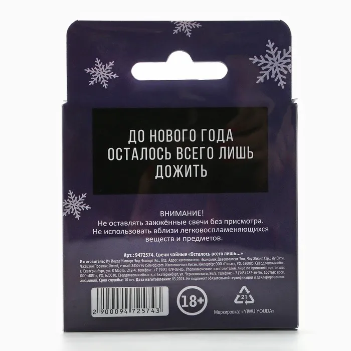 Свечи новогодние чайные «Осталось всего лишь..», без аромата, набор 4 шт, диам. 3,7 см — Характеристики