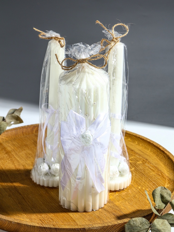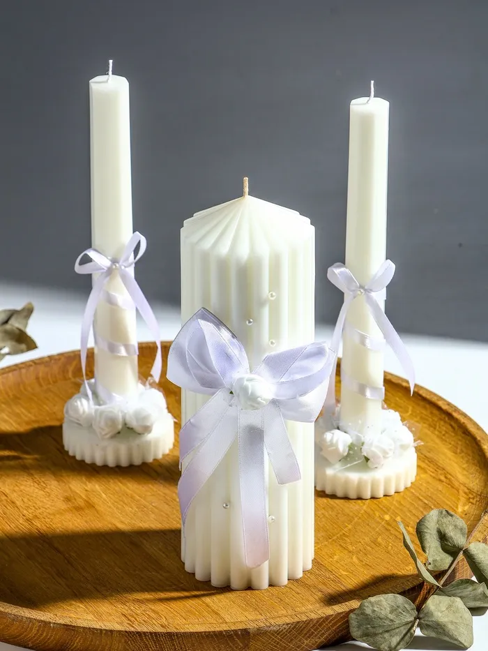 Позвольте мягкому свечению этих свечей стать символом начала вашего совместного пути, наполненного теплом и взаимопониманием. Этот набор из трёх изящных свечей выполнен в классическом белом цвете, олицетворяющем чистоту чувств и светлую радость предстоящего торжества. Их лаконичный дизайн и благородный оттенок делают их универсальным элементом оформления, который подчеркнёт значимость момента и создаст особую атмосферу уюта и гармонии.