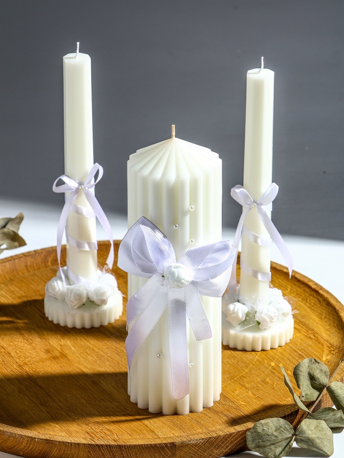 Исполненные из качественного парафина, эти свечи горят ровно и продолжительно, символизируя прочность семейных уз. Их классическое бело-золотое сочетание гармонично впишется в любую свадебную палитру — от роскошной до минималистичной, добавляя церемонии элегантности и завершённости.