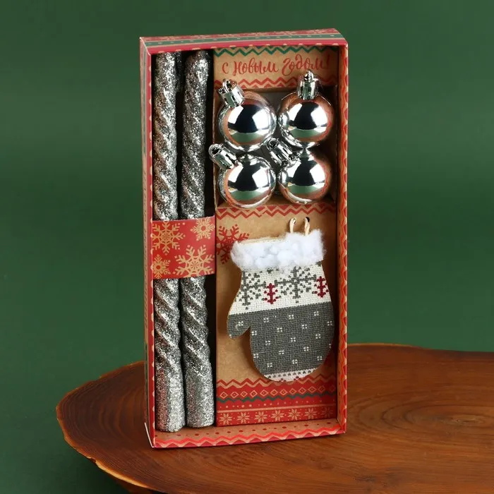 Набор витых свечей с декором прекрасно впишутся в любой новогодний интерьер и создадут праздничное настроение. Такой подарок отлично подойдет для подарка вашим родным и близким, благодаря красивой упаковке. В набор входит 2 античные свечи (1,5 х 1,5 х 20 см.), 4 елочных шара (2,5 х 3,5 см.) и подвеска на елку в виде варежки (5,5 х 0,5 х 8,5 см.)