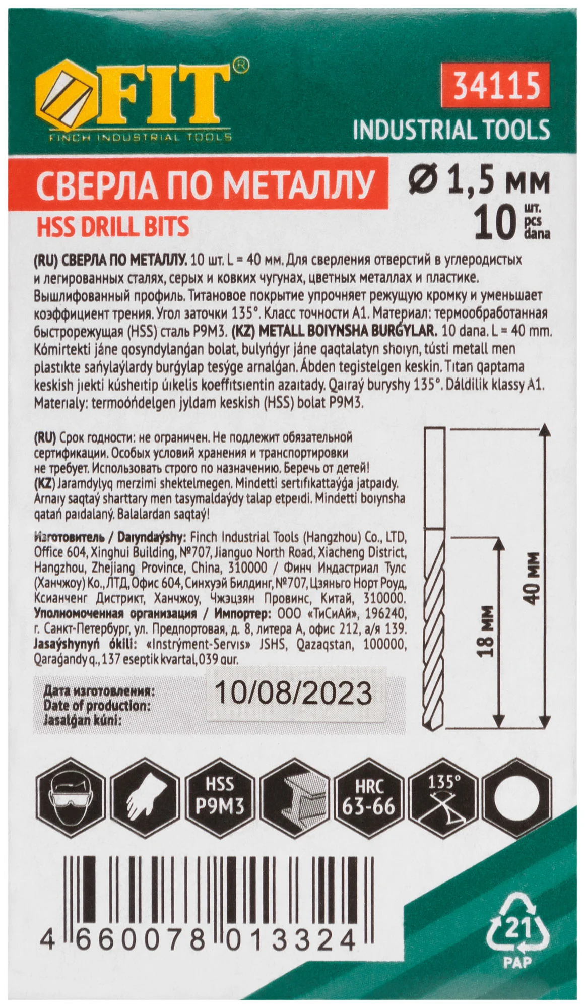 Сверла FIT 34115 идеально подходят для сверления отверстий в металлических поверхностях. Этот комплект из 10 штук позволяет проводить работы без перерывов на замену инструмента, что особенно ценно при серийном производстве или на стройплощадке.
