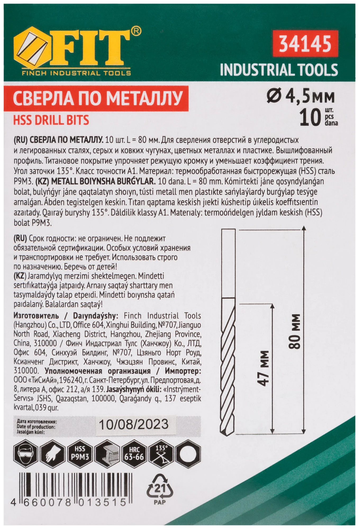 Изготовленные из быстрорежущей стали с титановым покрытием, сверла обладают высокой износостойкостью и обеспечивают продолжительный срок службы при интенсивной эксплуатации. Диаметр 4,5 мм позволяет использовать их для широкого спектра задач.