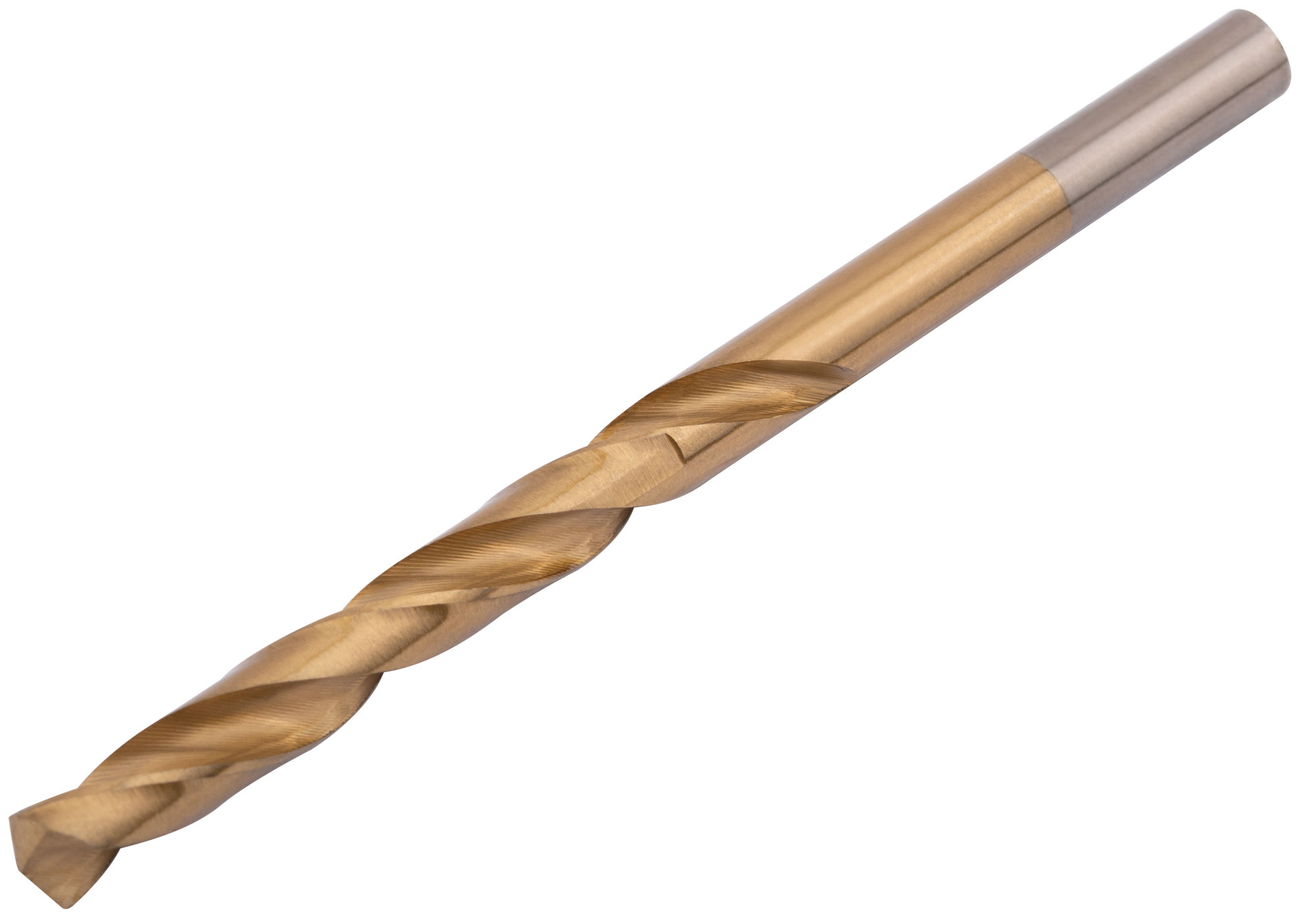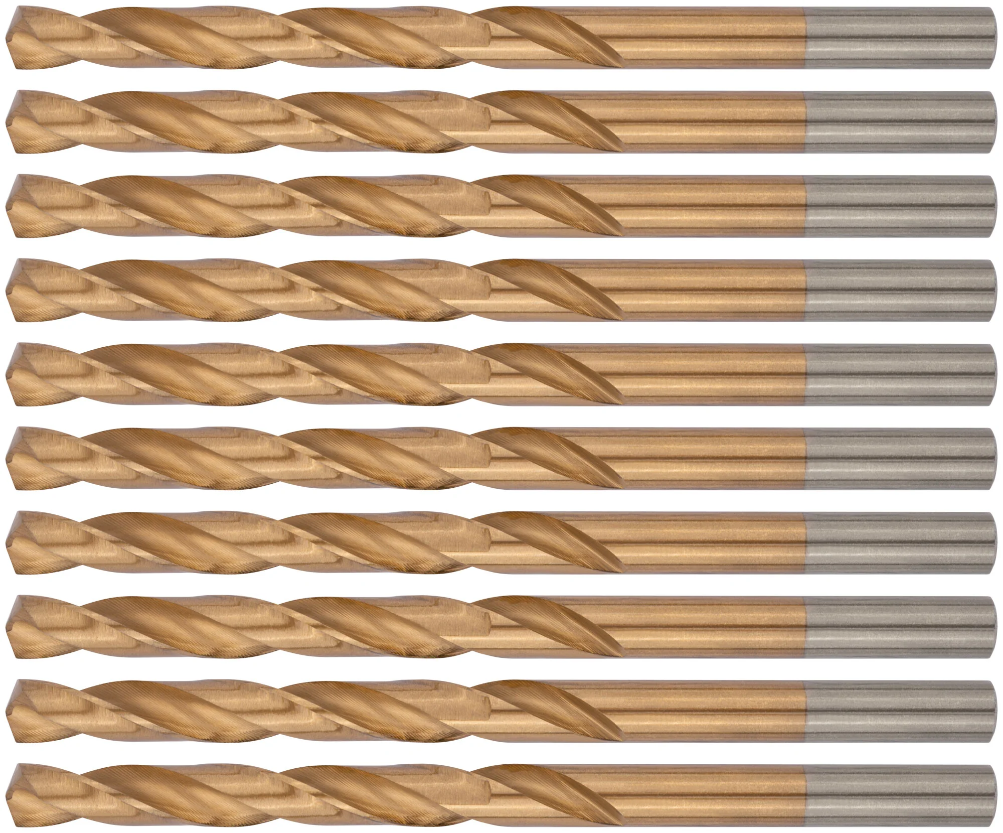 Сверла выполнены из быстрорежущей стали с титановым покрытием, что увеличивает их прочность и снижает износ. Цилиндрический хвостовик и вышлифованный профиль обеспечивают легкую и точную работу, а угол заточки 135 градусов способствует эффективному сверлению.