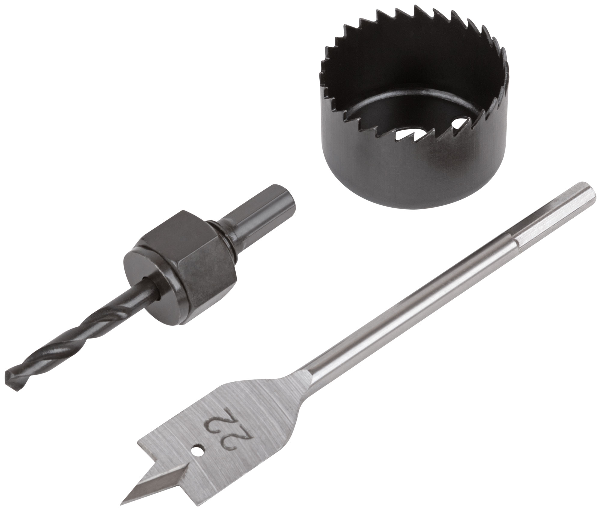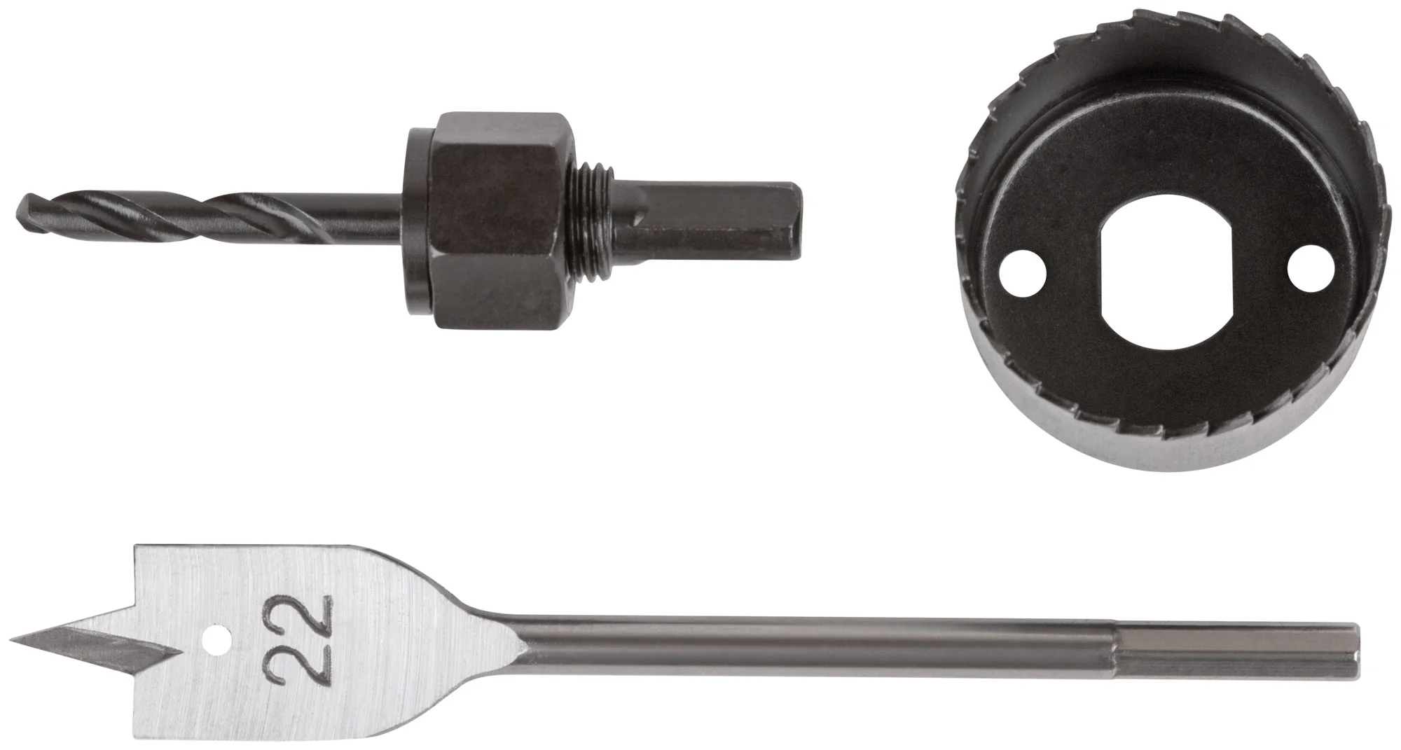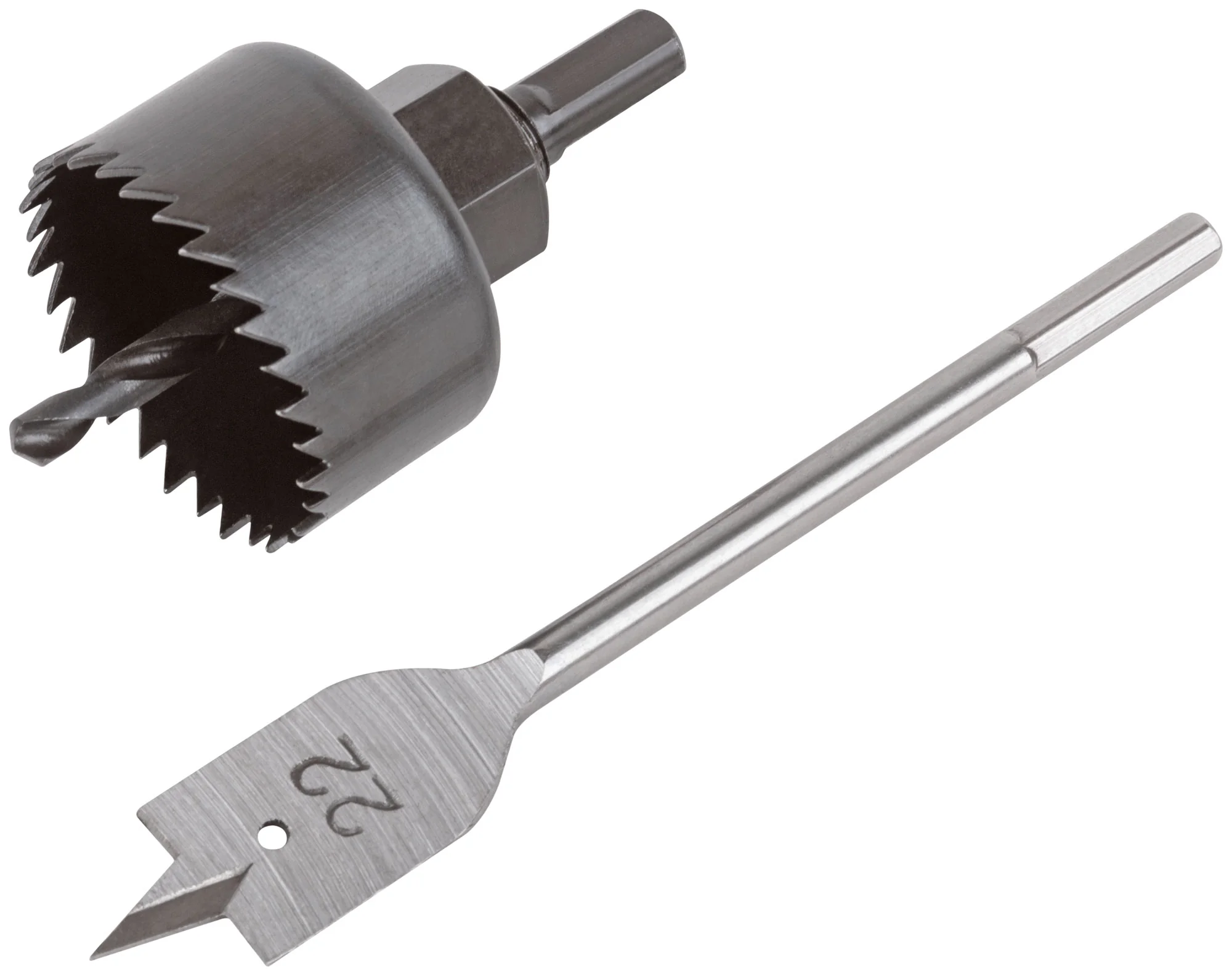 Изготовленные из инструментальной стали, эти сверла обеспечивают точность и надежность. В набор входят коронка диаметром 54 мм, направляющее сверло диаметром 6 мм и перовое сверло 22 мм.