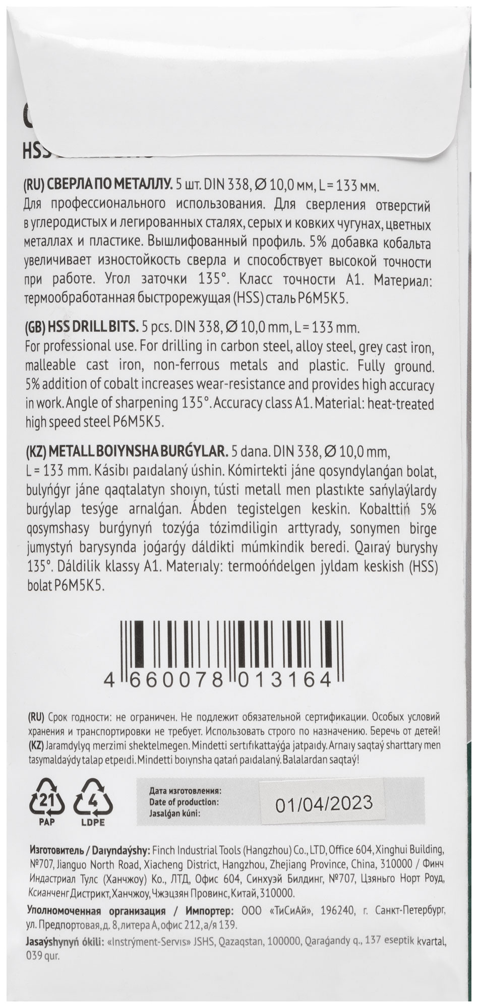Сверла выполнены из быстрорежущей стали HSS Р6М5К5 с 5% добавкой кобальта, что обеспечивает им высокую износостойкость и прочность. Угол заточки 135 градусов и цилиндрический хвостовик позволяют легко справляться с твердыми материалами.