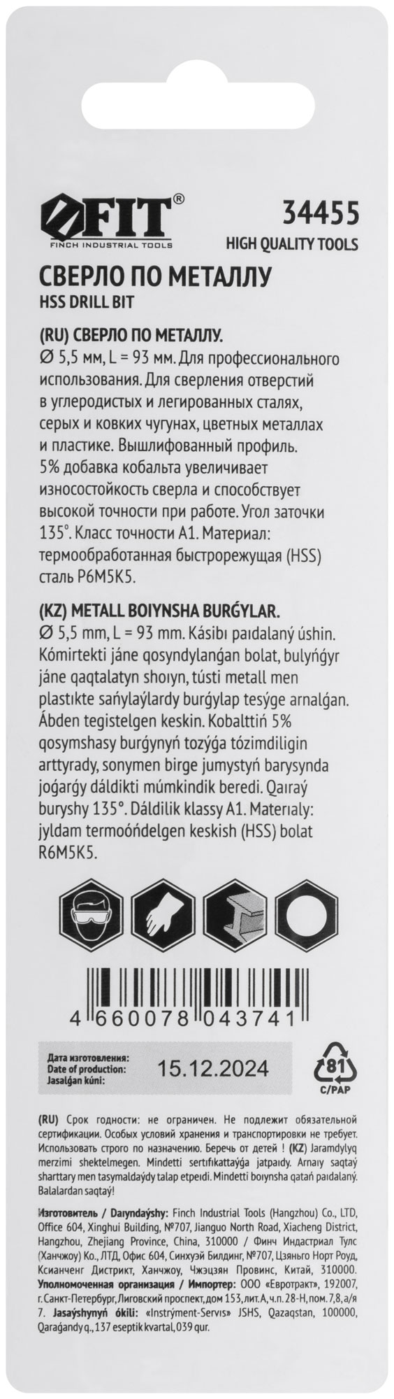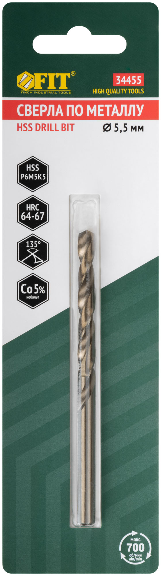Сверло FIT диаметром 5,5 мм идеально подходит для точного сверления металлов в профессиональных условиях. Незаменимо для мастеров, которым требуется высокая надежность и долговечность инструмента в работе с металлическими деталями.