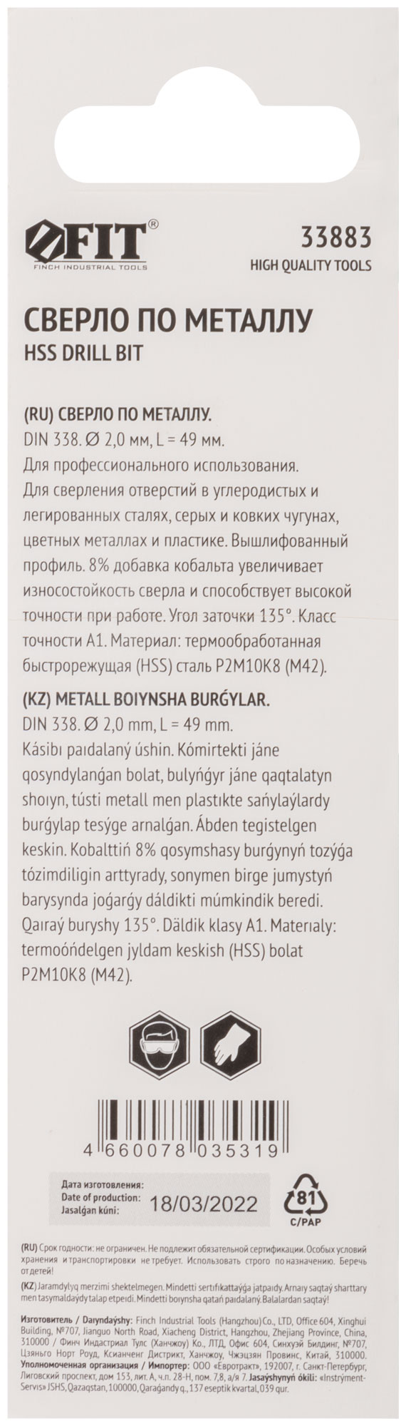 Сверло изготовлено из быстрорежущей стали марки Р2М10К8 (М42), что гарантирует его надежность и долговечность. Угол заточки в 135° и цилиндрический хвостовик обеспечивают легкость и точность сверления. Упаковано в блистер для удобства хранения и транспортировки.