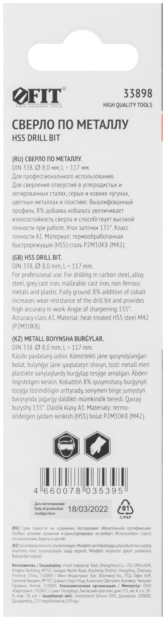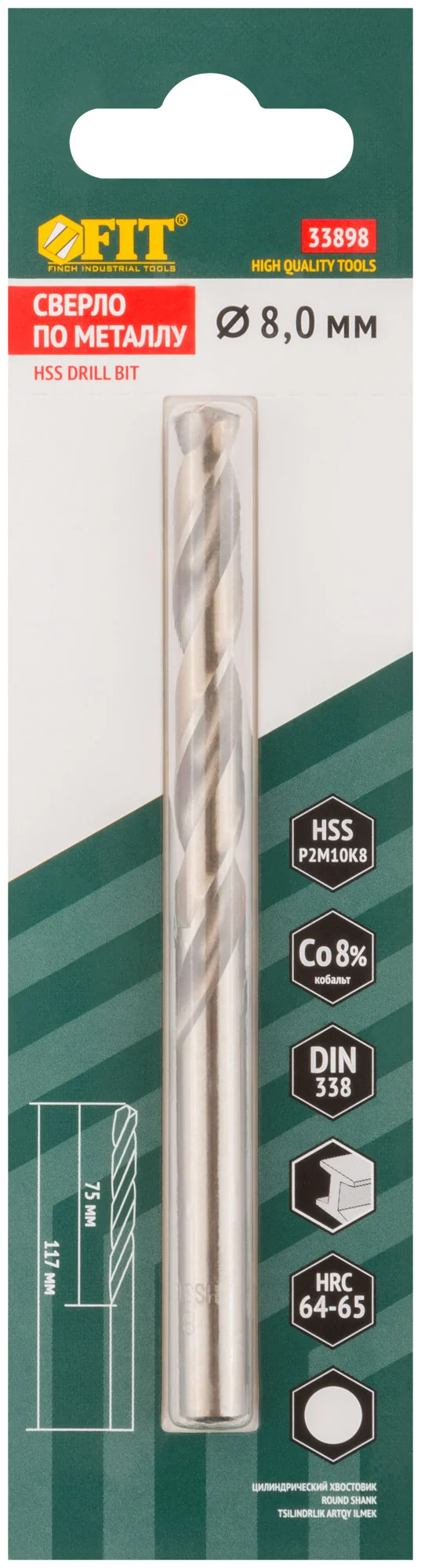 Сверло FIT 8,0x117 мм идеально подходит для профессионального сверления металла, обеспечивая высокую точность и долговечность благодаря добавке кобальта 8%. Незаменимо на промышленных и строительных площадках, где требуется надежность и устойчивость к износу.