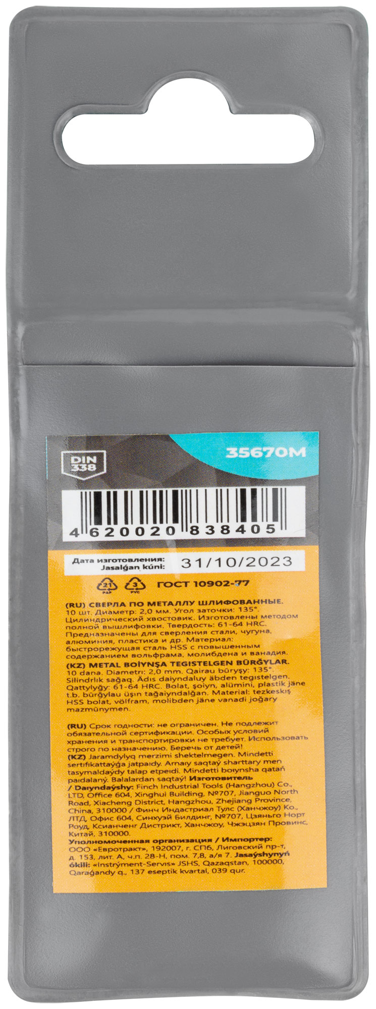 - 10 сверл в пакете с подвесом.