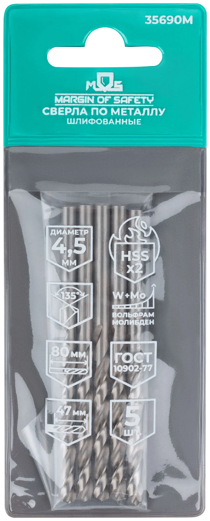 - 5 сверл HSS 4,5x80 мм с углом заточки 135°