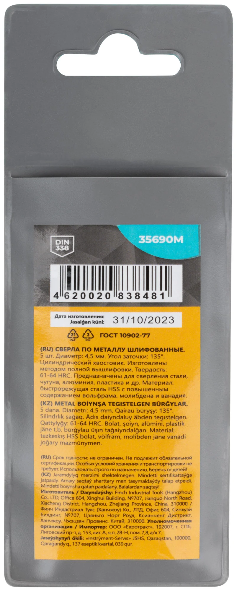 Сверла HSS 4,5x80 мм с углом заточки 135° для металла
