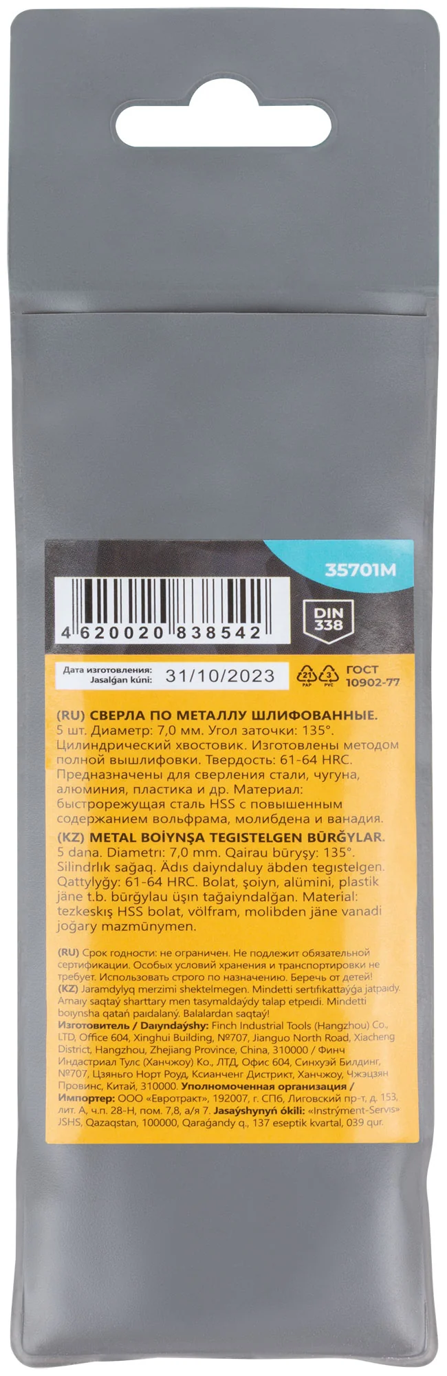 Шлифованные сверла имеют цилиндрический хвостовик и соответствуют стандарту DIN338, что делает их универсальными для использования с большинством дрелей и станков. Упаковка с подвесом облегчает хранение и транспортировку.