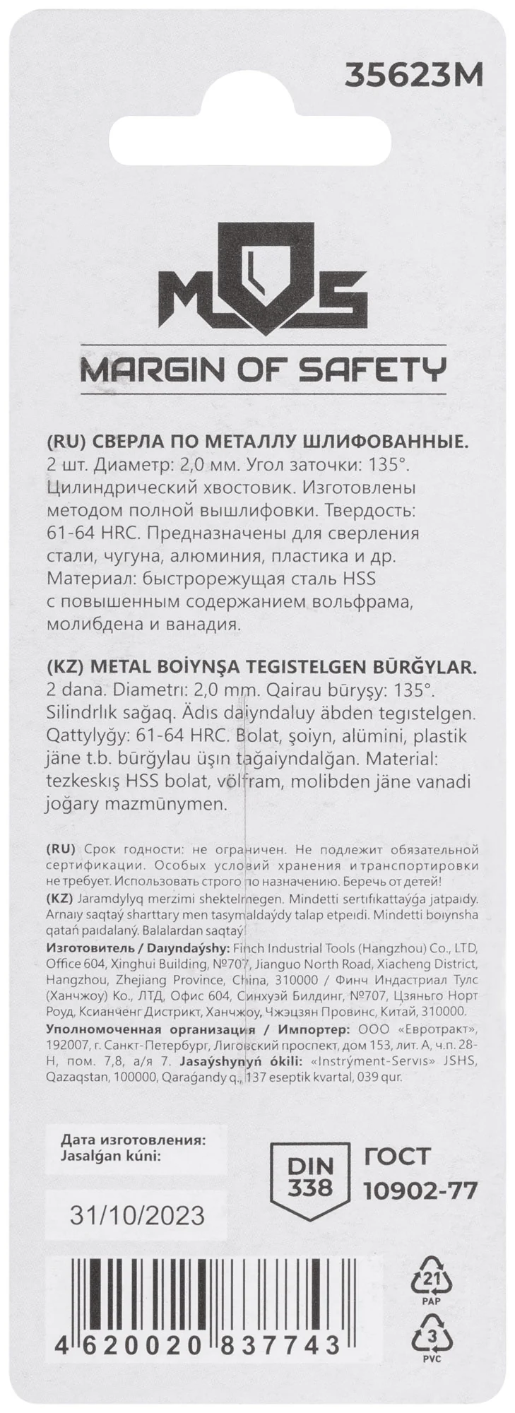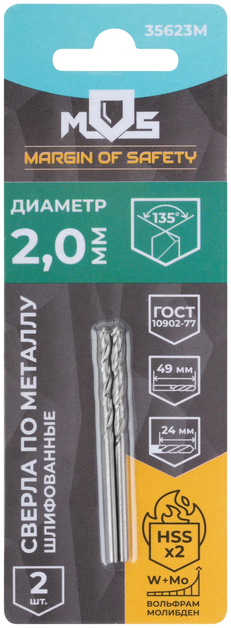 Сверла по металлу HSS шлифованные в блистере, угол заточки 135°, 2,0 x 49 мм (2 шт.)