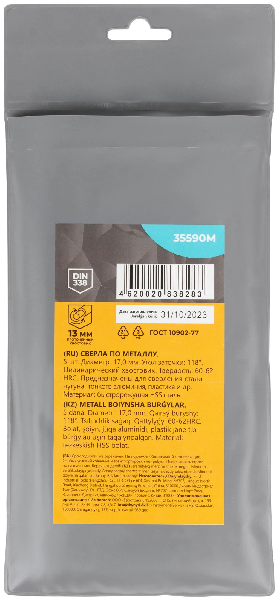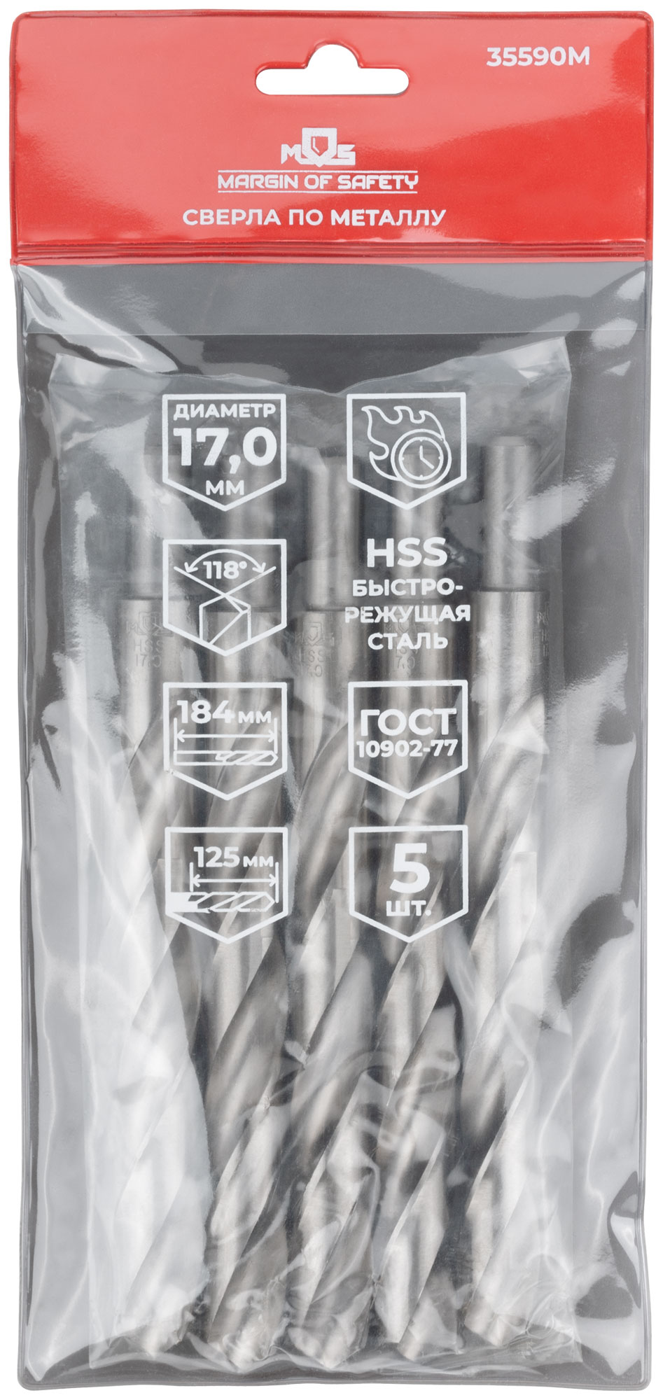 Сверла по металлу HSS, угол заточки 118°, 17,0 x 184 мм, (5 шт.)