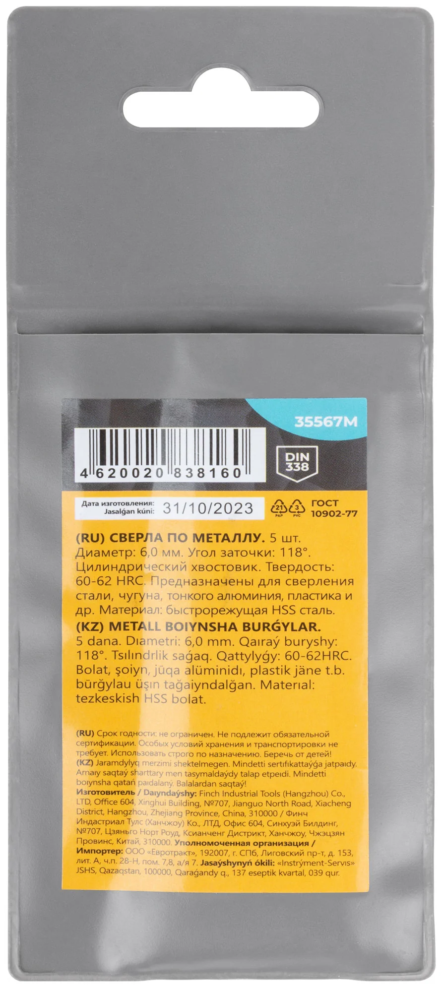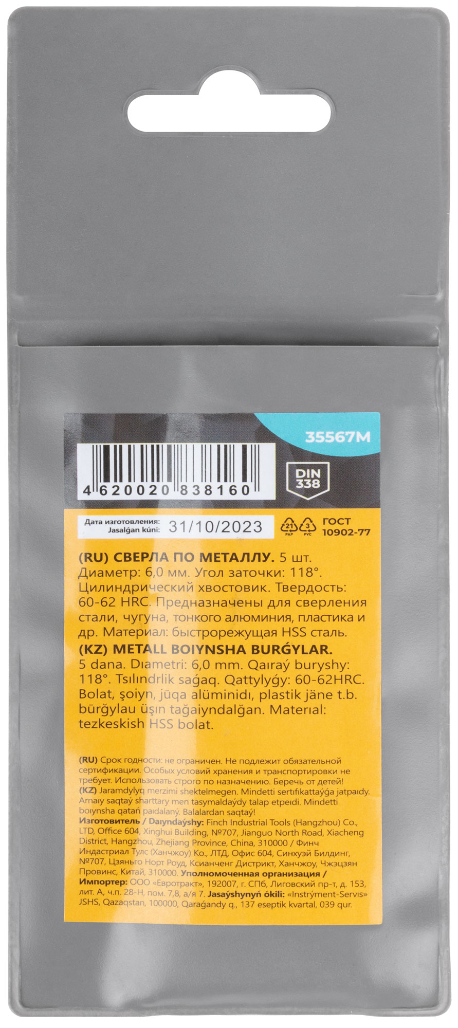Сверла по металлу HSS, угол заточки 118°, 6,0 x 93 мм, (5 шт.)