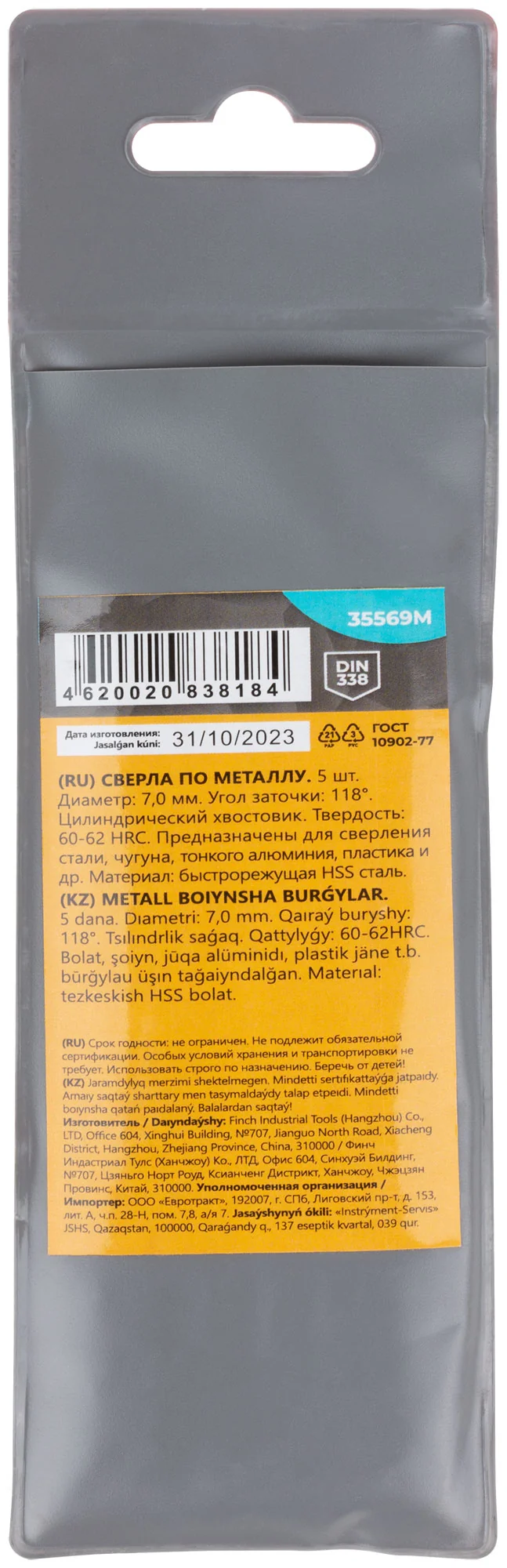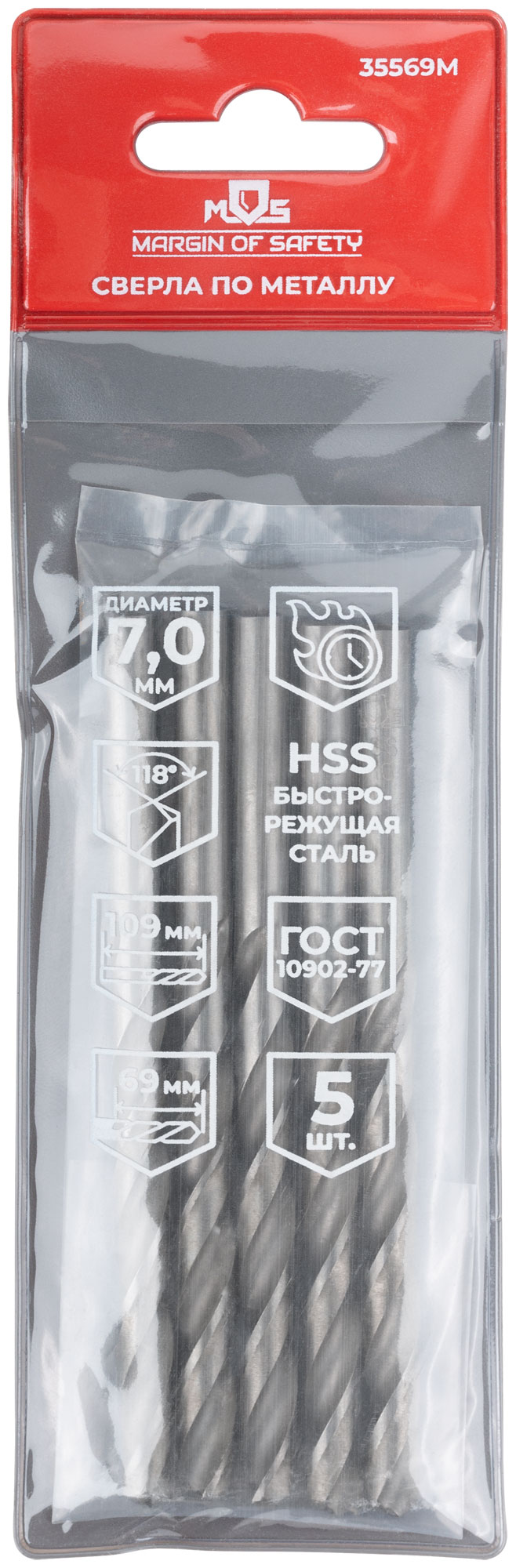 Сверла по металлу HSS, угол заточки 118°, 7,0 x 109 мм, (5 шт.)