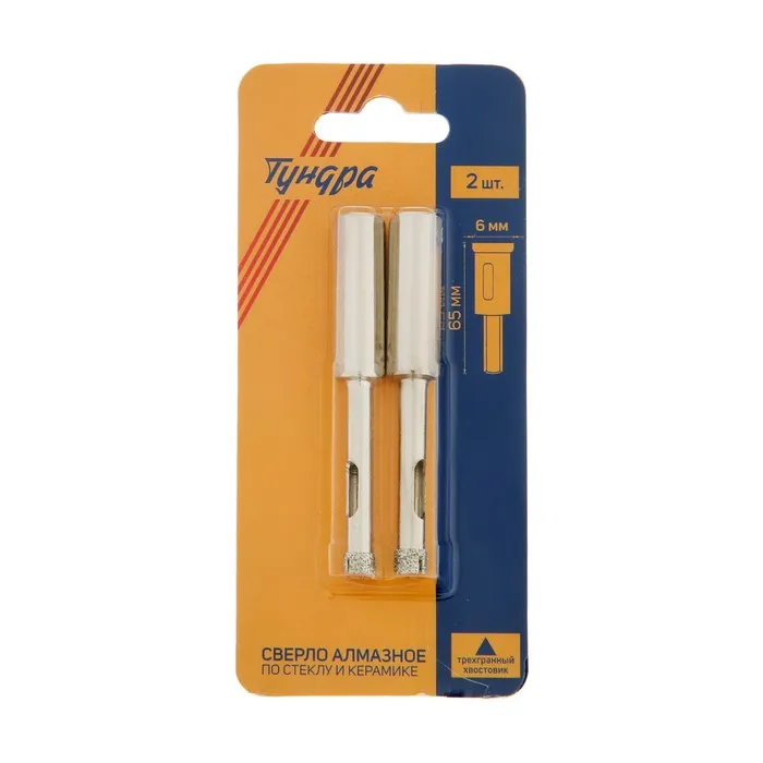 Сверло алмазное по стеклу и керамике ТУНДРА, трехгранный хвостовик, 6×65 мм, 2 шт. — Характеристики