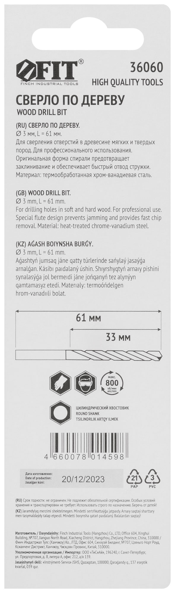 Сверло изготовлено из хром-ванадиевой стали, что обеспечивает долговечность и устойчивость к износу. Цилиндрический хвостовик обеспечивает надежную фиксацию в патроне, а типоразмер 3х61 мм позволяет использовать сверло в большинстве стандартных дрелей.