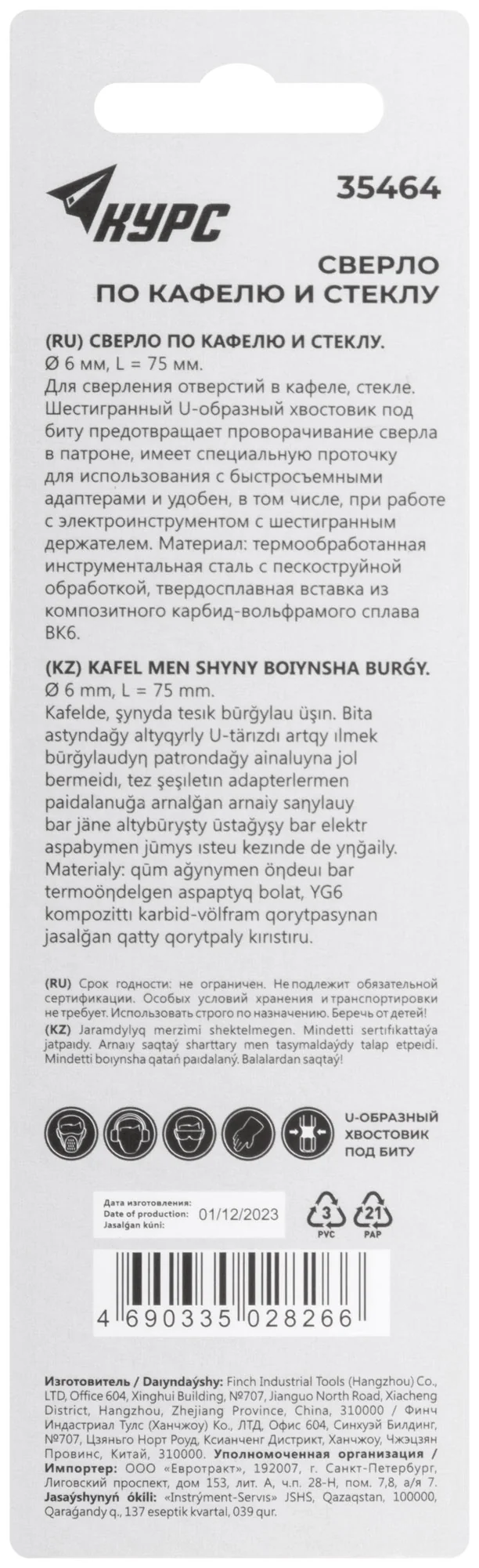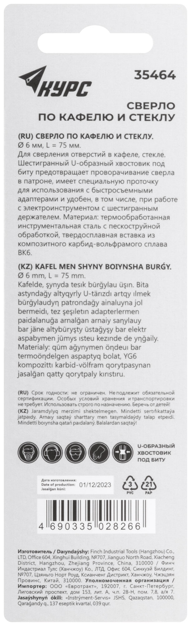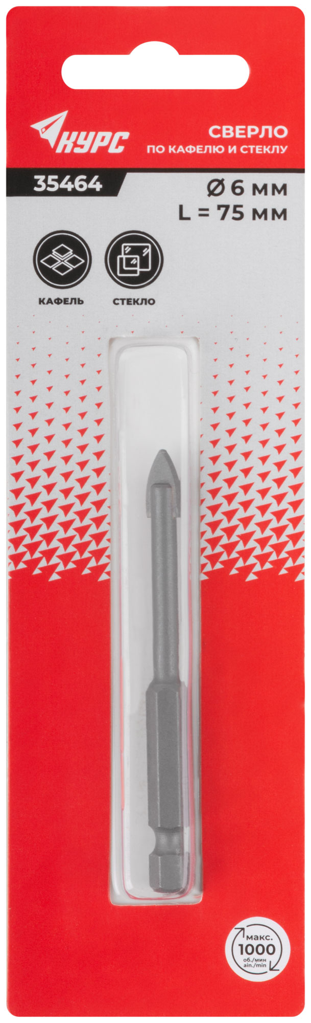 Сверло КУРС 6х75 мм идеально подходит для сверления отверстий в кафеле и стекле. Используйте его для создания аккуратных и точных отверстий без риска повреждения материала.
