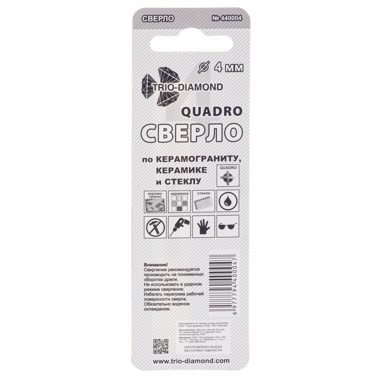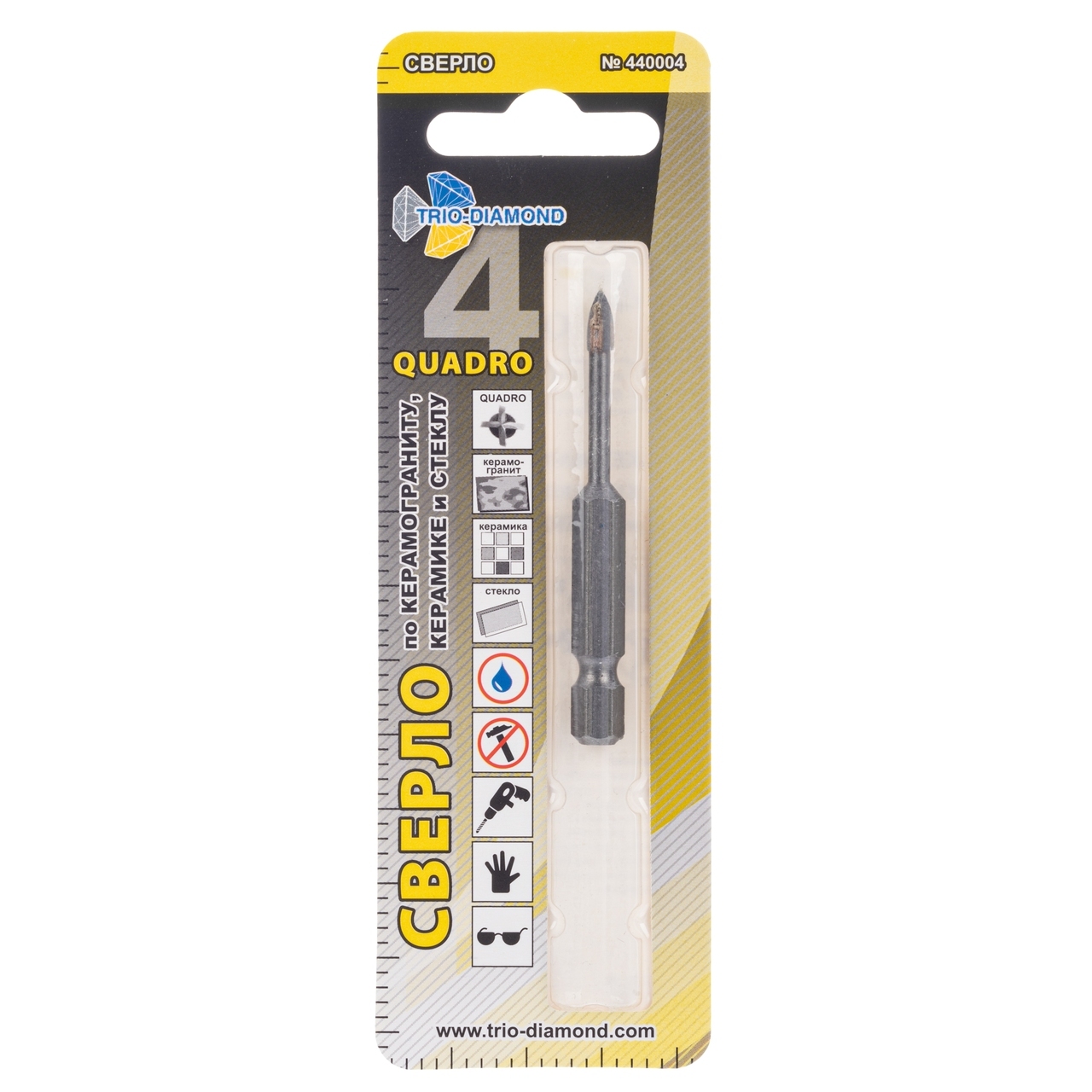 Сверло TRIO-DIAMOND диаметром 4 мм из серии Quadro станет незаменимым помощником при работе с керамогранитом, керамической плиткой и стеклом. Оно позволяет аккуратно и точно выполнять отверстия, минимизируя риск повреждения материала.
