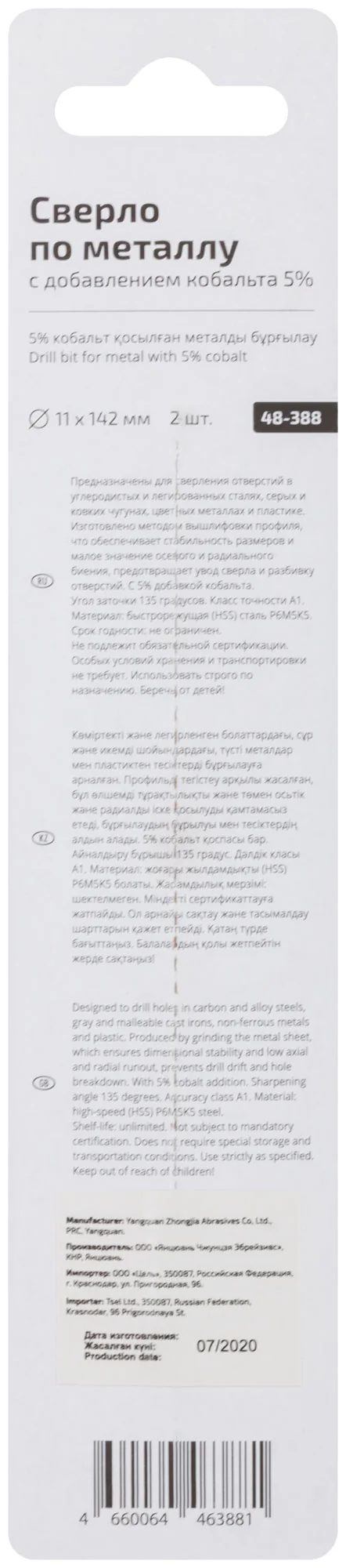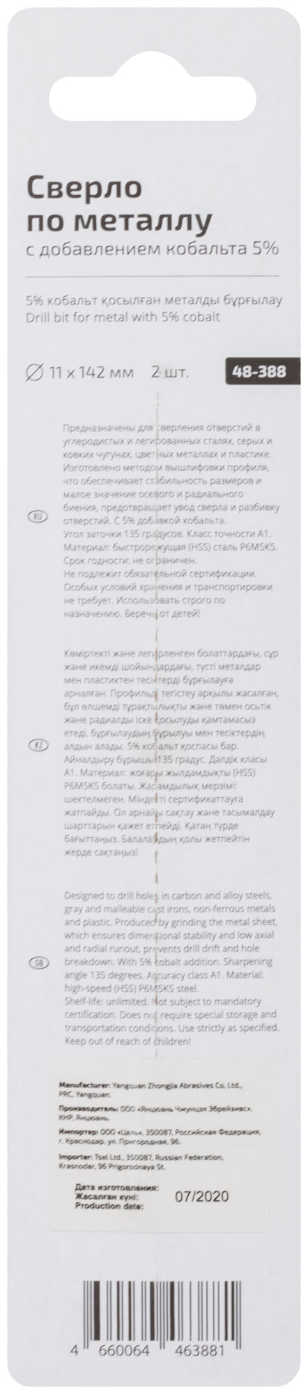 Сверло изготовлено из быстрорежущей стали HSS с добавлением 5% кобальта, что значительно увеличивает его стойкость и долговечность. Угол заточки 135° и цилиндрический хвостовик способствуют легкому началу сверления и стабильной работе.
