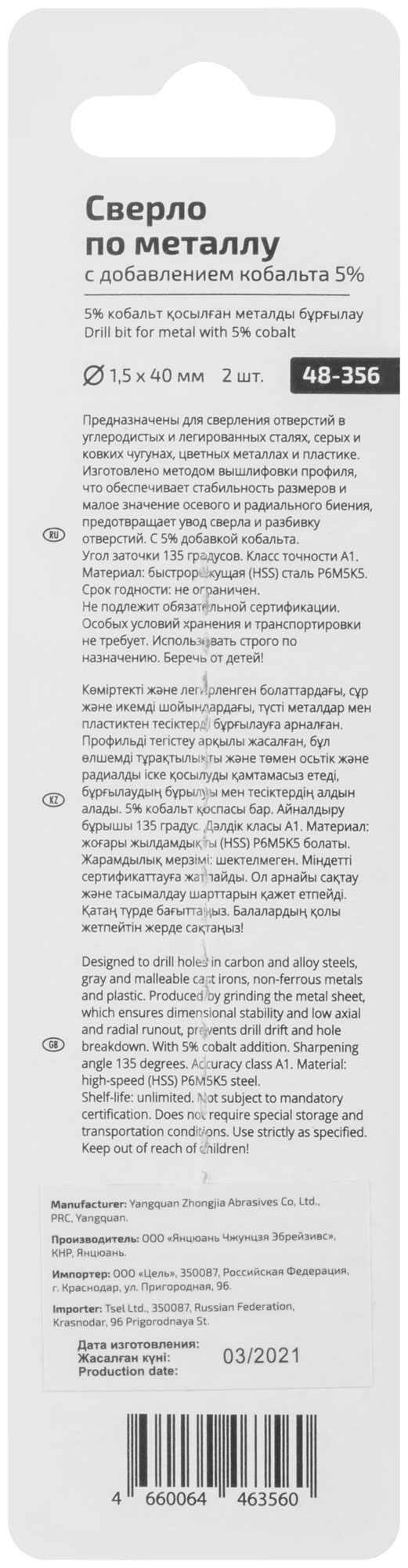 Изготовлено из быстрорежущей стали HSS с добавлением кобальта, что обеспечивает высокую прочность и долговечность. Цилиндрический хвостовик и угол заточки 135° гарантируют устойчивость и точность.
