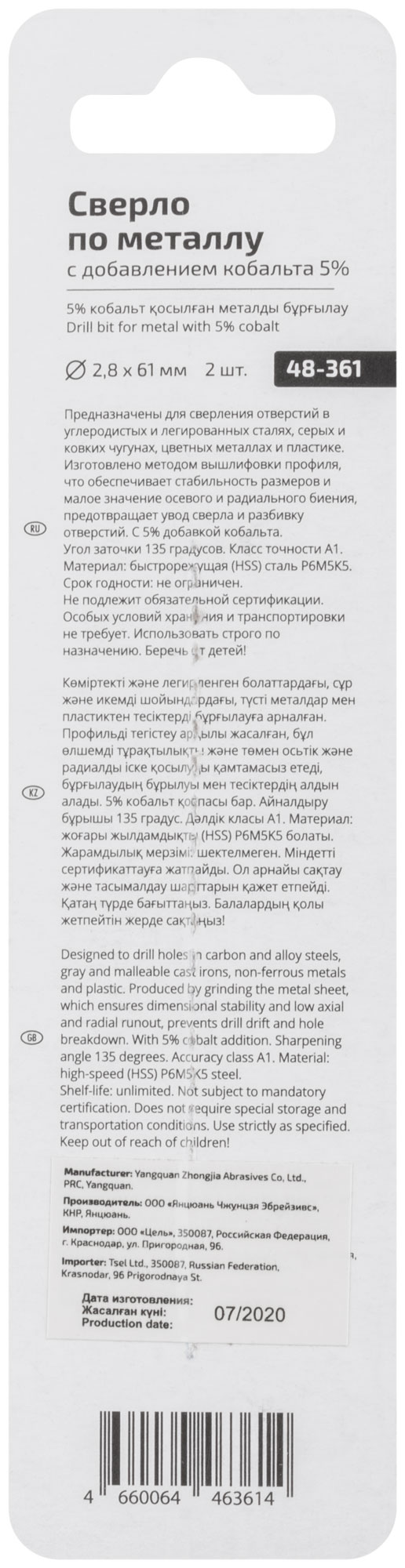 Сверло изготовлено из быстрорежущей HSS стали с добавлением 5% кобальта, что обеспечивает ему высокую износостойкость и устойчивость к перегреву. Цилиндрический хвостовик и угол заточки 135° способствуют стабильной и эффективной работе.