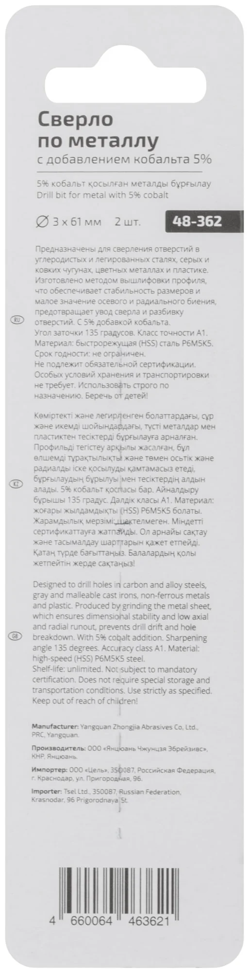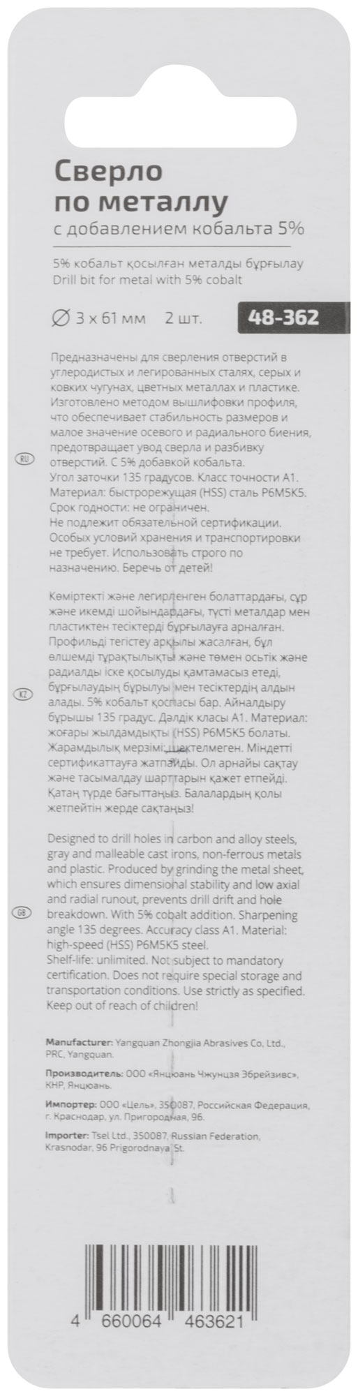 Изготовлено из быстрорежущей стали HSS с добавлением кобальта 5% (Р6М5К5), что обеспечивает долговечность и устойчивость к износу. Цилиндрический хвостовик и угол заточки 135° позволяют сверлу легко входить в материал, минимизируя нагрузку на инструмент.