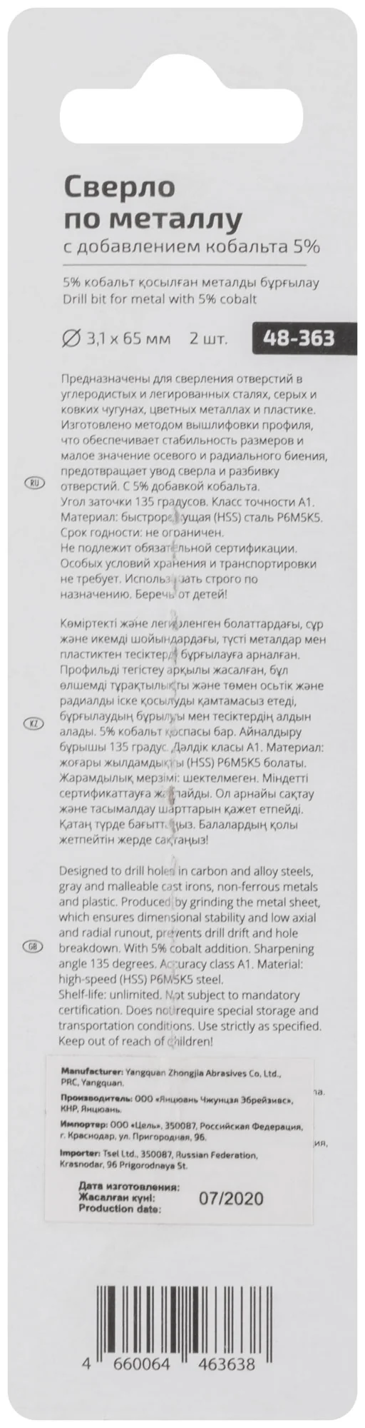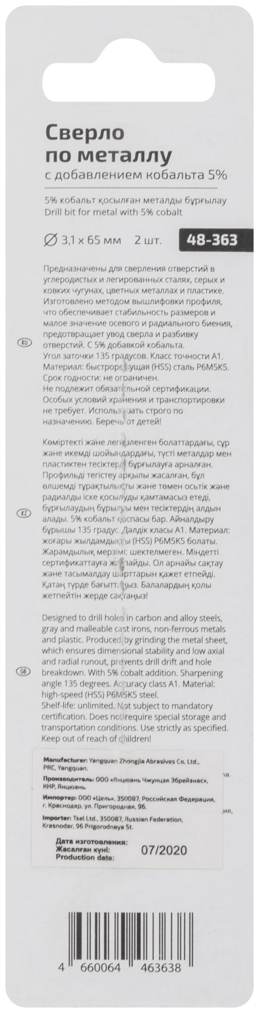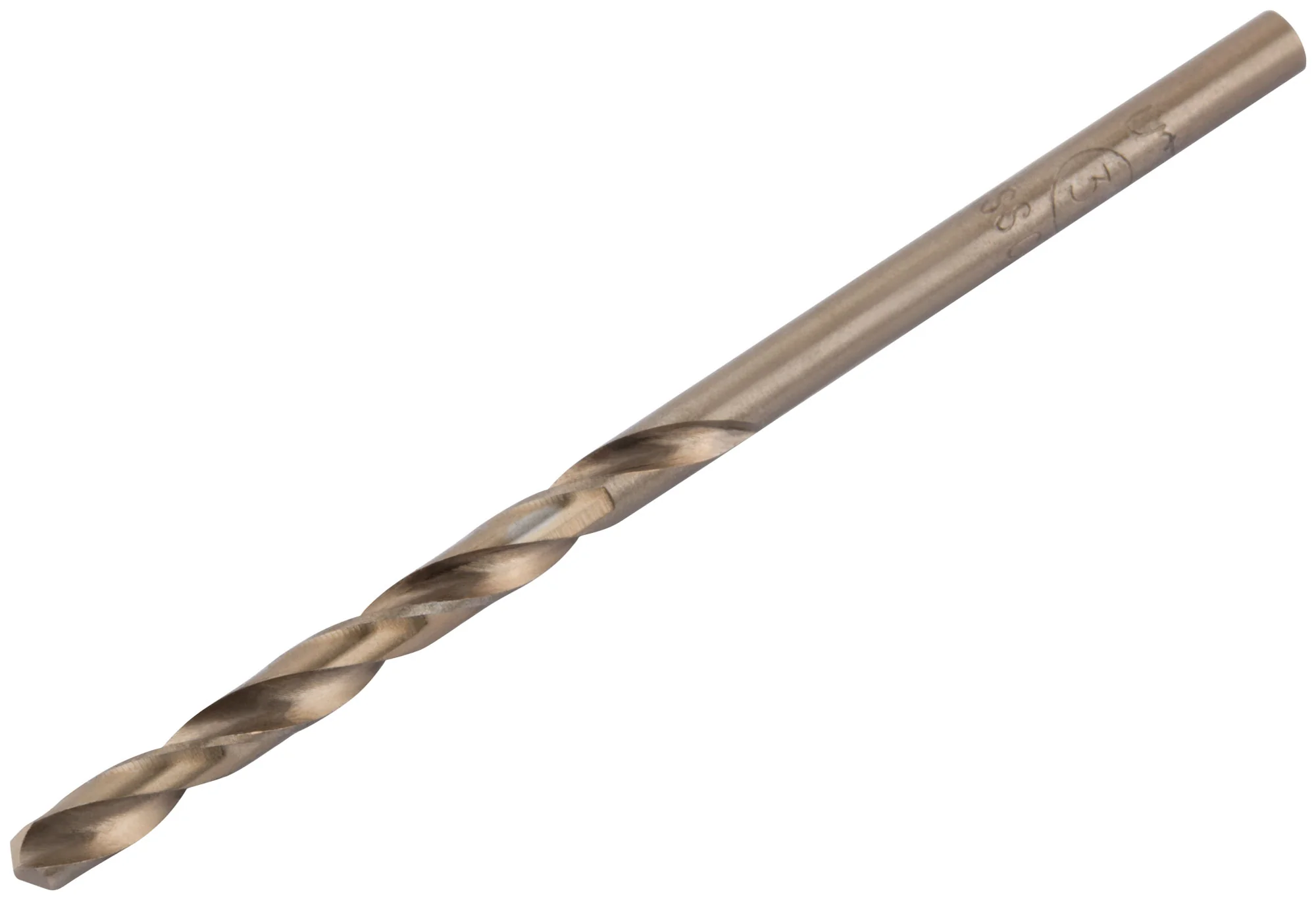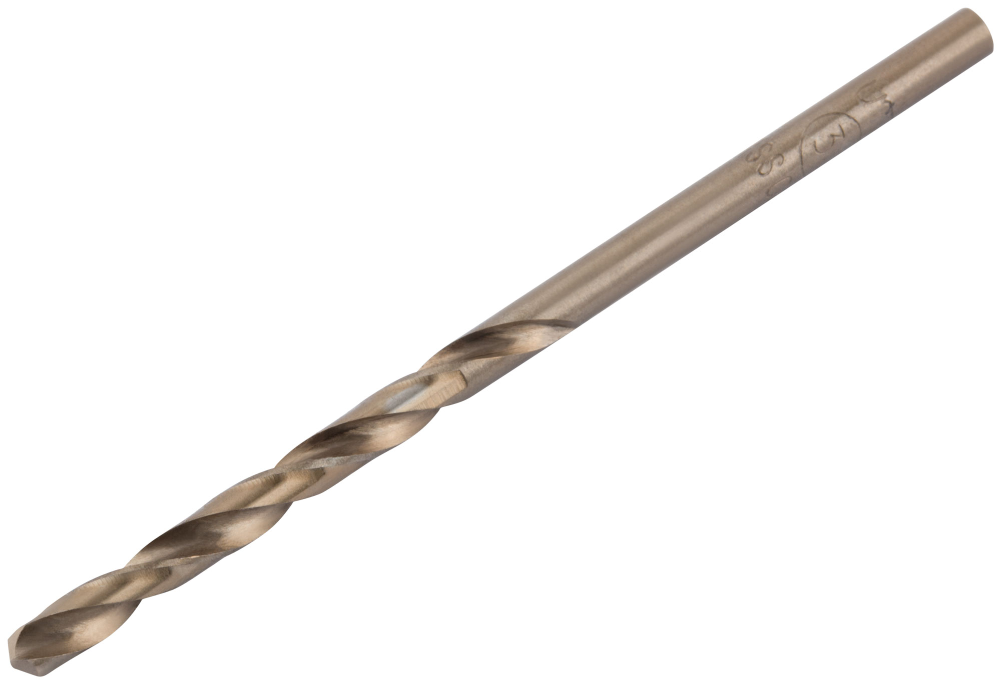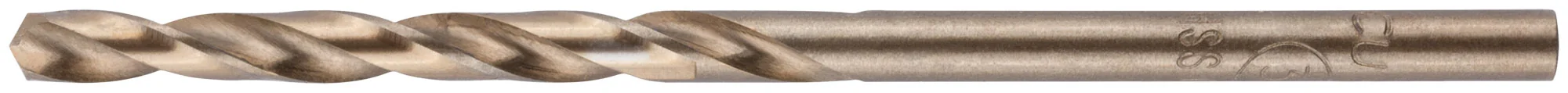 Изготовлено из быстрорежущей HSS стали с добавлением 5% кобальта (Р6М5К5), что обеспечивает высокую износостойкость и долговечность. Угол заточки 135° и цилиндрический хвостовик способствуют легкому началу сверления и оптимальному удалению стружки.