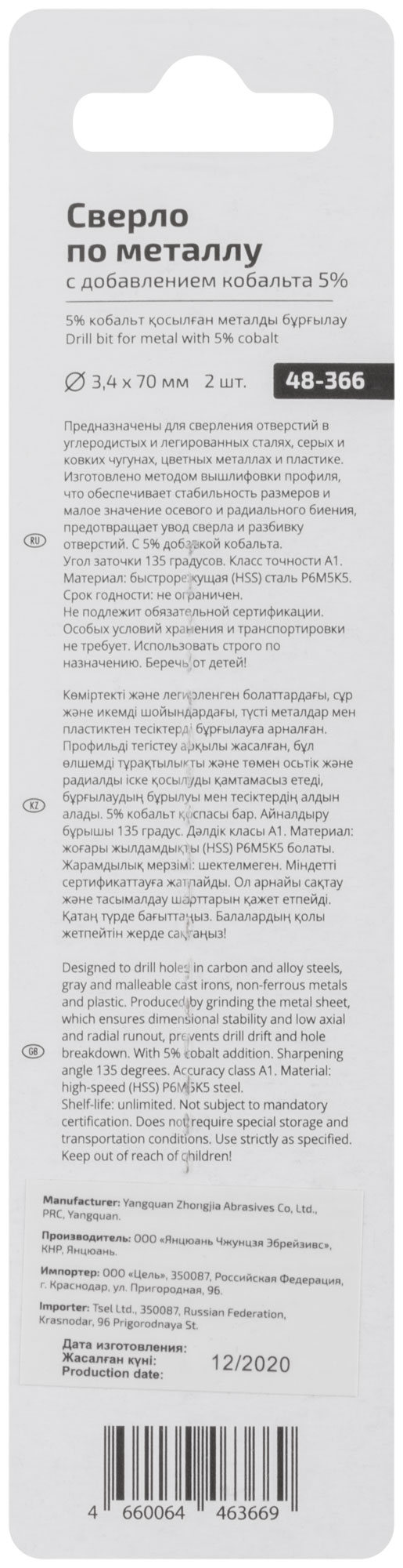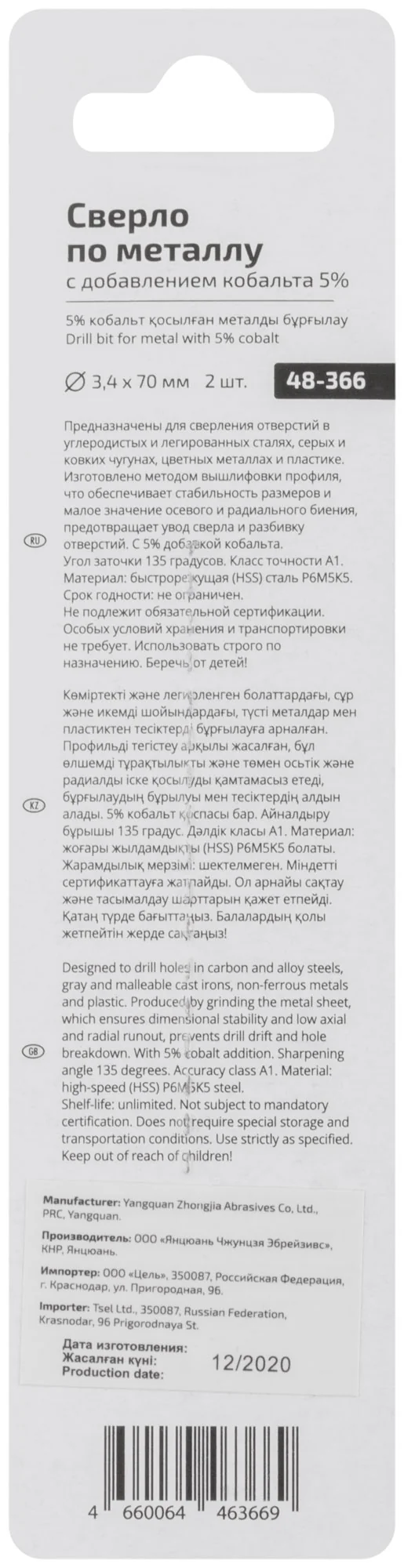 Сверло по металлу 3,4 x 70 мм с кобальтом 5% для профессионального сверления