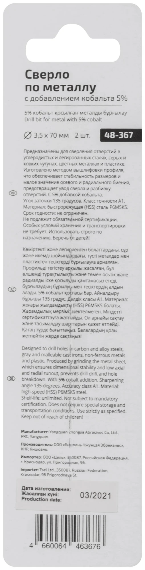 Это сверло изготовлено из быстрорежущей стали HSS с добавлением 5% кобальта, что значительно увеличивает его износостойкость и долговечность. Цилиндрический хвостовик и угол заточки 135° способствуют легкому и точному сверлению.