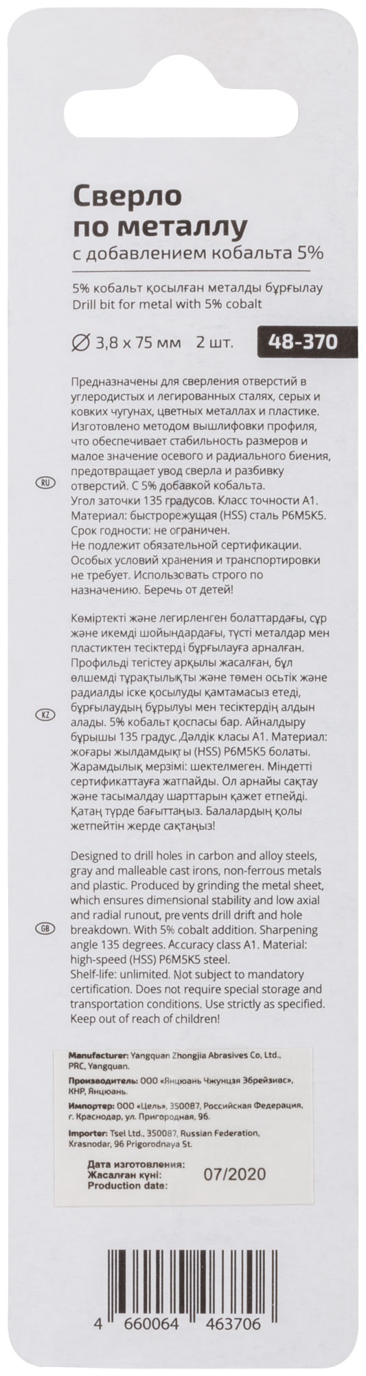 Изготовлено из быстрорежущей стали HSS с добавлением 5% кобальта, это сверло обладает высокой износостойкостью и долговечностью. Цилиндрический хвостовик обеспечивает надежную фиксацию в патроне, а угол заточки 135° способствует легкому началу сверления без смещения.
