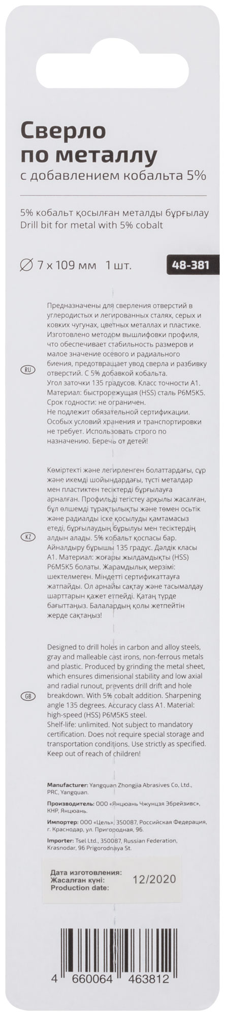 Изготовленное из быстрорежущей стали HSS с добавлением 5% кобальта (Р6М5К5), сверло обеспечивает высокую прочность и стойкость к нагреву. Цилиндрический хвостовик и угол заточки в 135° способствуют легкому началу сверления и уменьшению вибраций.