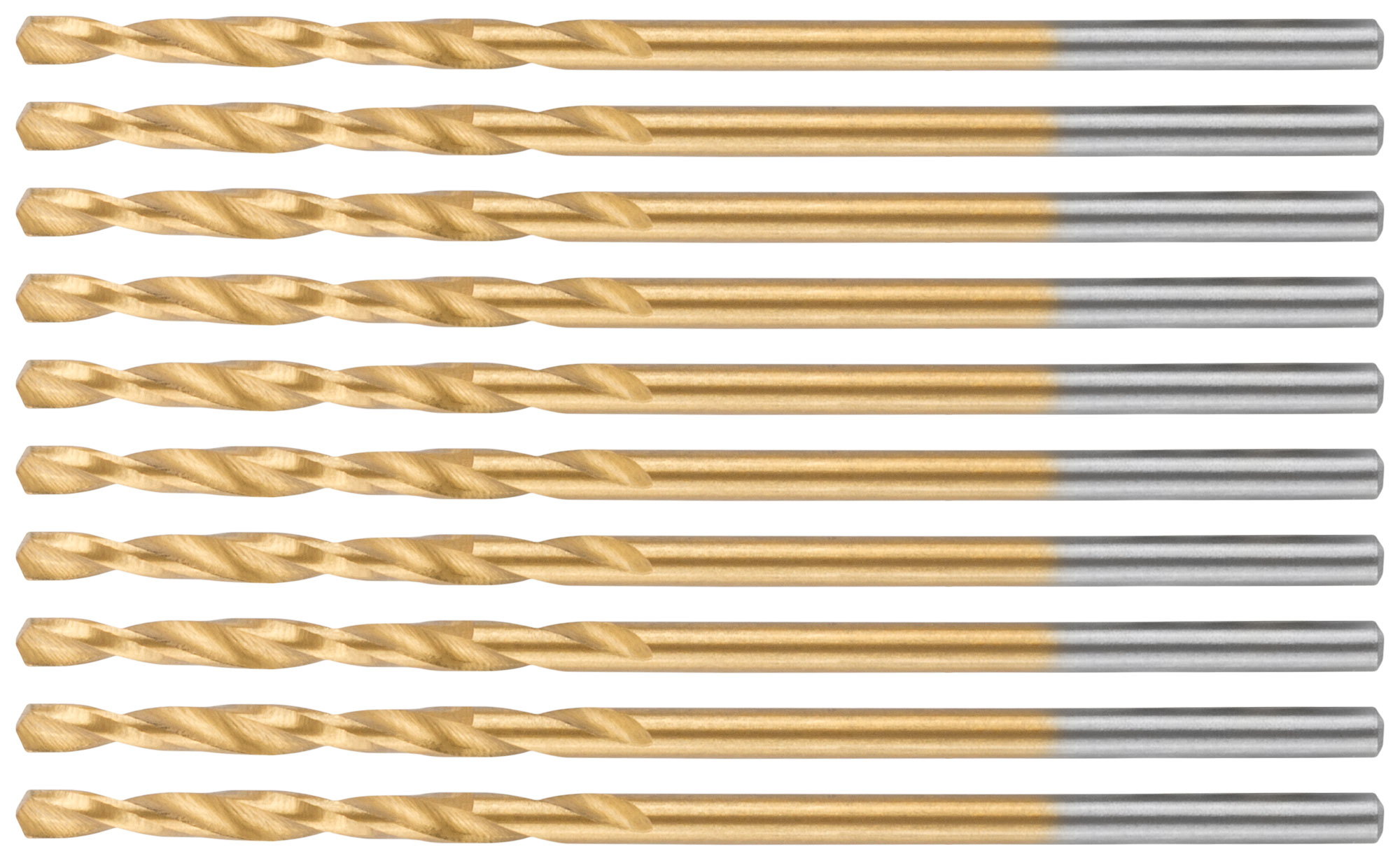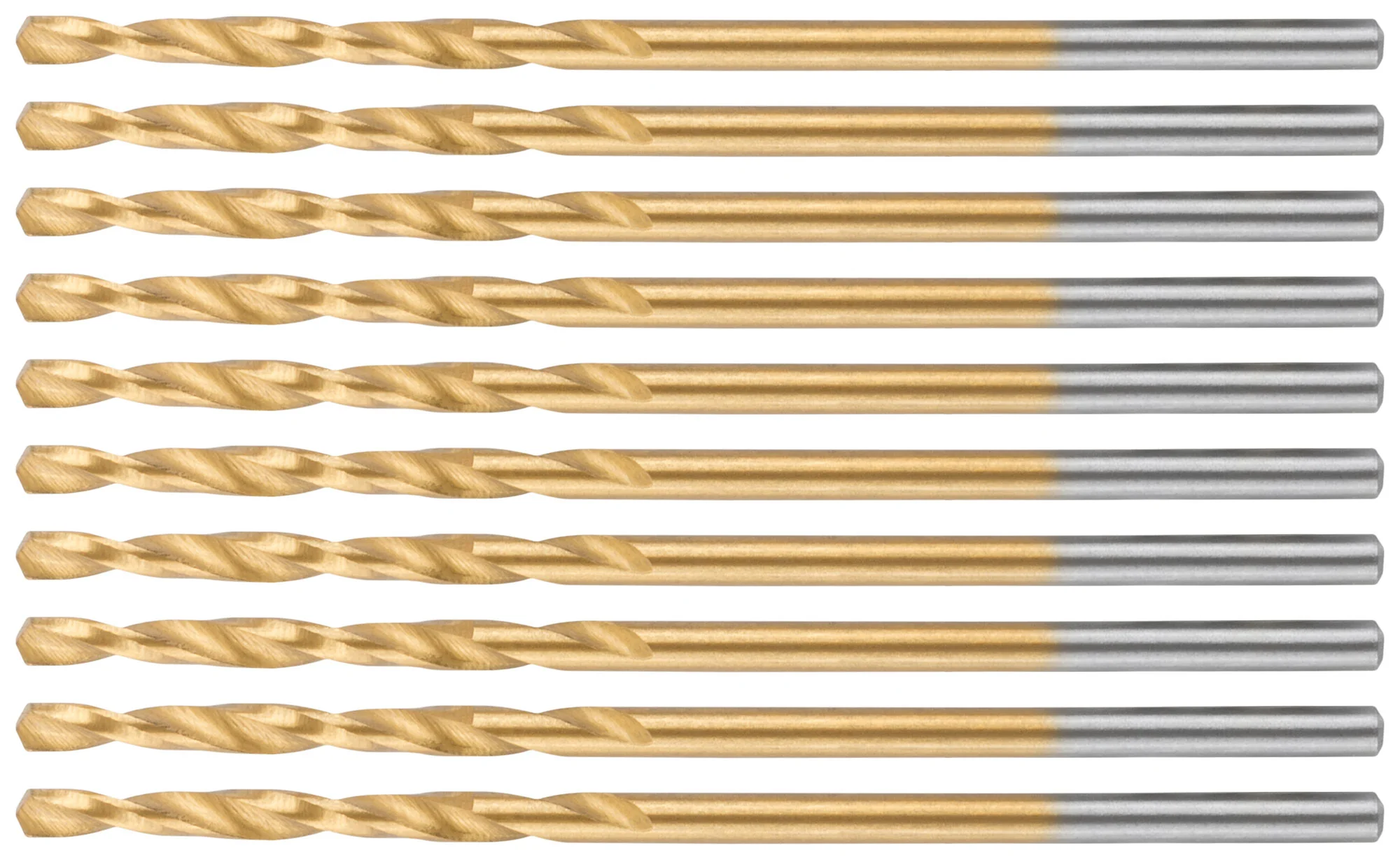 Каждое сверло изготовлено из высококачественной быстрорежущей стали HSS с твердостью 64-64 HRC, что обеспечивает отличную стойкость к износу. Титановое покрытие (TiN) укрепляет лезвие, значительно продлевая срок службы изделия. Крестообразный угол заточки 135° и класс точности А1 минимизируют осевое и радиальное биение.