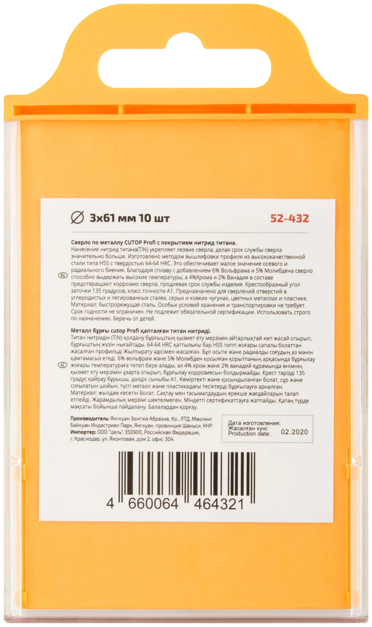 Изготовлено из быстрорежущей стали с добавлением 6% вольфрама и 5% молибдена, что обеспечивает устойчивость к высоким температурам. Покрытие из нитрида титана (TiN) значительно продлевает срок службы сверла, укрепляя его лезвие и защищая от коррозии благодаря 4% хрома и 2% ванадия в составе.