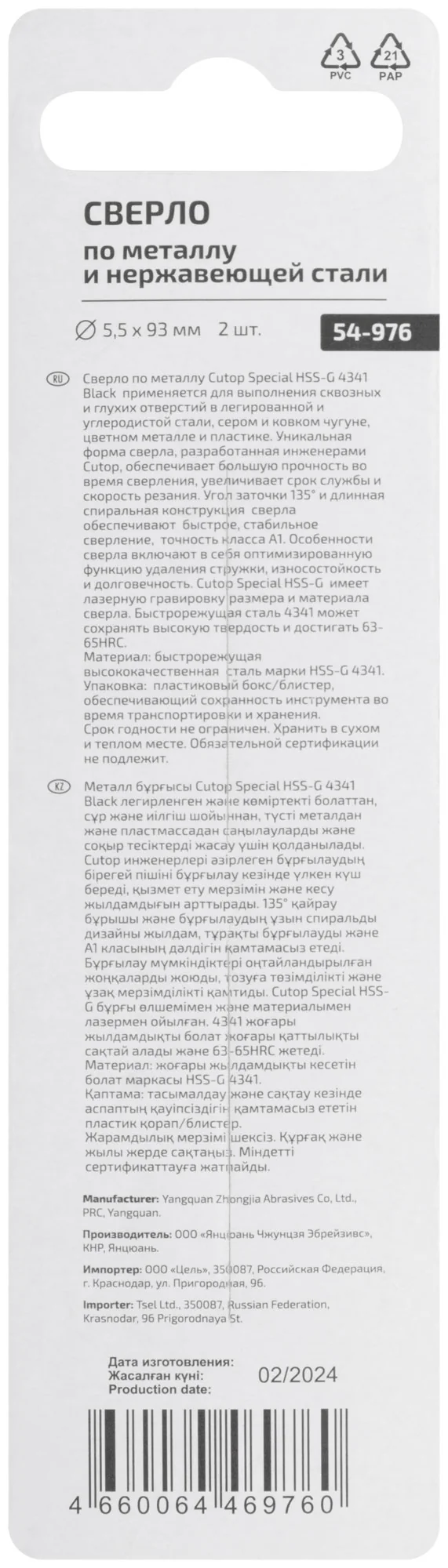 Изготовлено из быстрорежущей стали HSS-G с твердостью от 63 до 67 HRC. Цилиндрический хвостовик обеспечивает надежную фиксацию в патроне, а угол заточки 135° и длинная спиральная конструкция обеспечивают стабильное сверление.