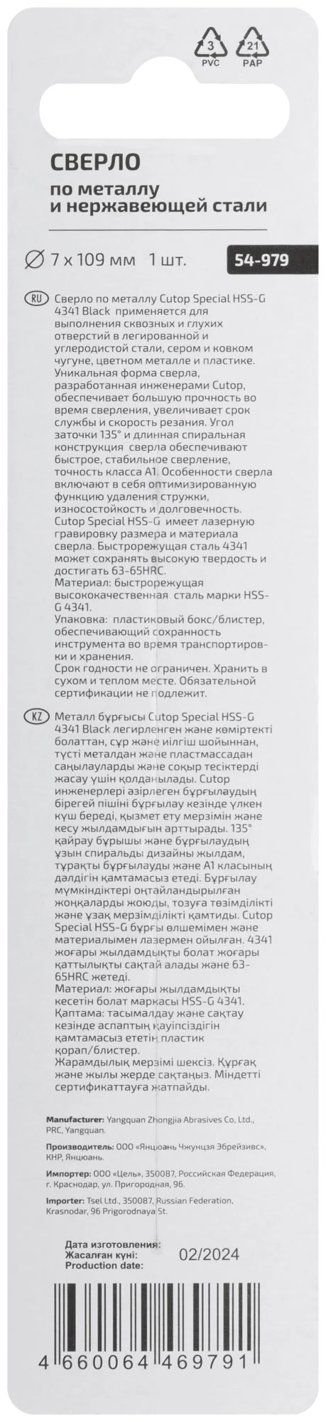 Сверло Cutop Special HSS-G диаметром 7 мм и длиной 109/62 мм идеально подходит для выполнения сквозных и глухих отверстий в металлических заготовках. Это сверло станет незаменимым помощником при работе с легированной и углеродистой сталью, серым и ковким чугуном, а также цветными металлами и пластиком.