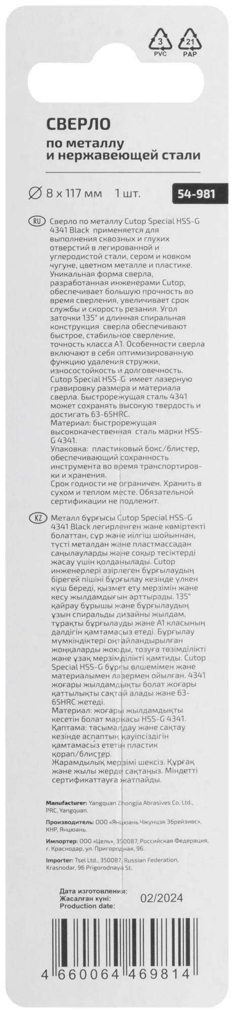 Сверло Cutop Special изготовлено из быстрорежущей высококачественной стали HSS-G с твердостью 63-67 HRC. Особая конструкция с углом заточки 135° и длинная спиральная форма обеспечивают быстрое и стабильное сверление. Лазерная маркировка позволяет легко определить размер и материал сверла.
