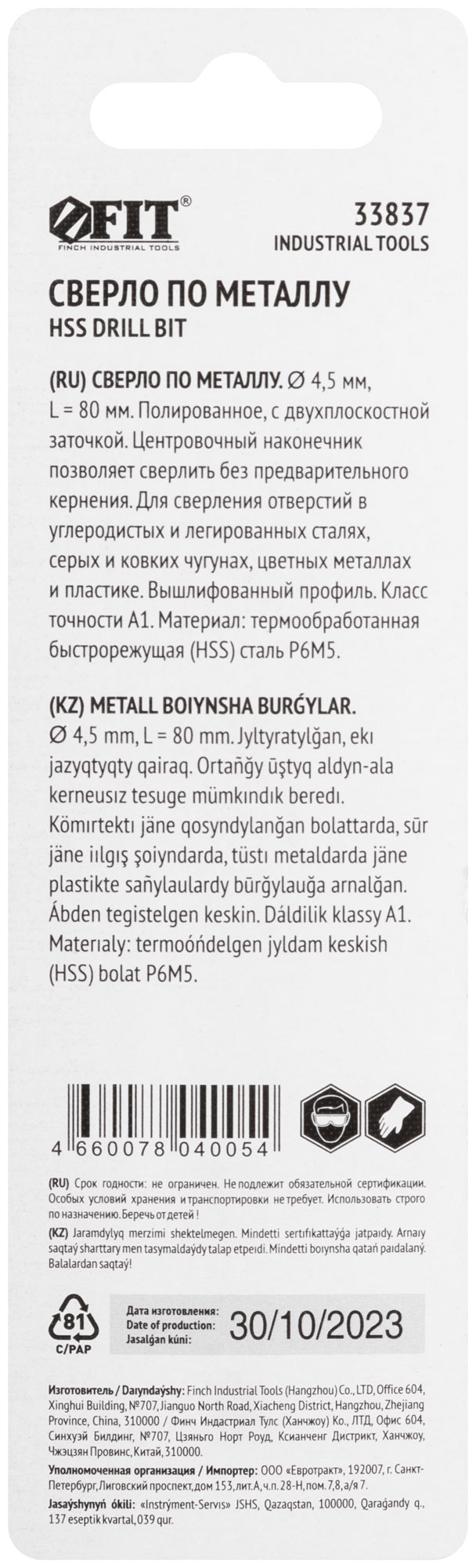 Выберите сверло FIT 33837, чтобы обеспечить высокую точность и надежность в сверлении металла.