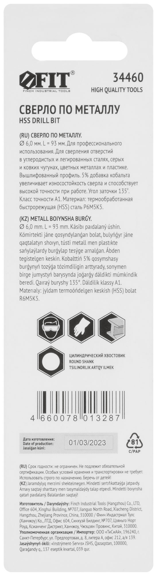 Выберите сверло FIT артикул 34460 для надежного и долговечного сверления металла в любых условиях.