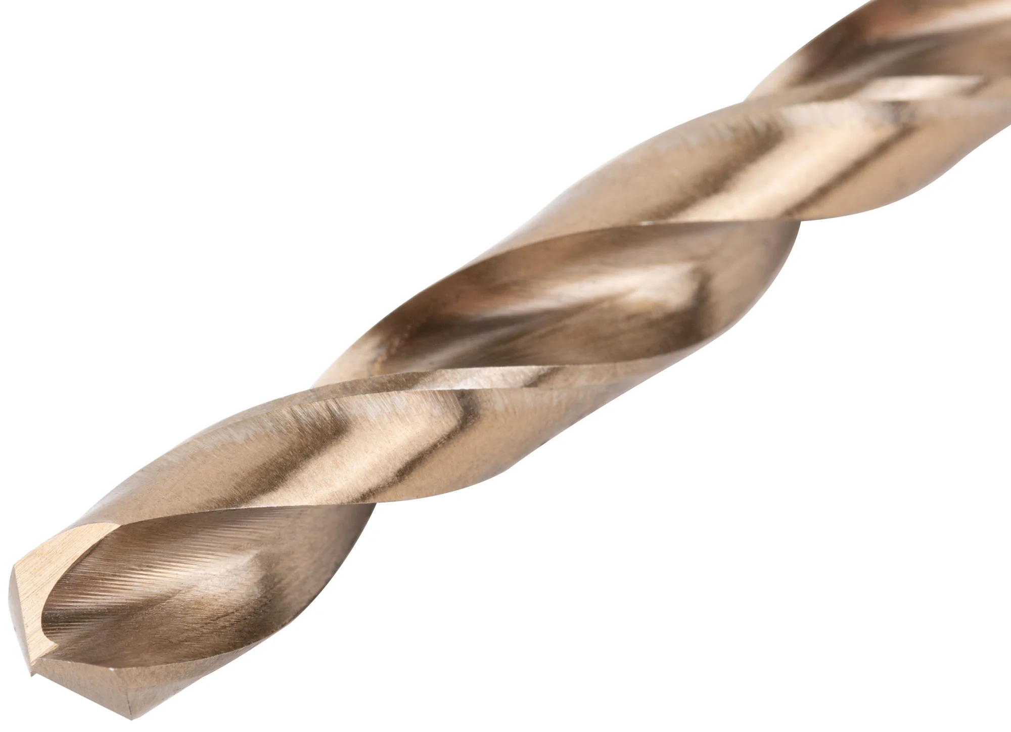 Сверло изготовлено из быстрорежущей стали HSS класса Р6М5К5 с добавлением 5% кобальта, что обеспечивает повышенную износостойкость и долговечность. Угол заточки 135 градусов и вышлифованный профиль гарантируют точное и чистое сверление.